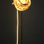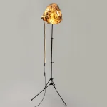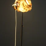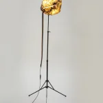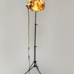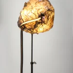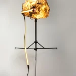 “Sympoietic” by Sabrina Merayo Nuñez intricately weaves the worlds of humans, non-humans, and technology, establishing a profound web of kinship. Drawing inspiration from both modern and medieval techniques, Sabrina has formulated a distinctive recipe for 100% biodegradable collagen-based bioplastic, reminiscent of ancient paint and adhesive preparations. Using this pioneering material, she fashions interactive lighting sculptures that engage with viewers through embedded motion sensors. These sculptures seamlessly incorporate carved artifacts, furniture fragments, veneers, and gleaming crystals.