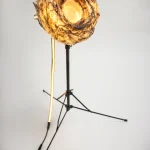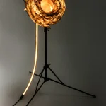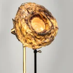 A standout within “Sympoietic” is the Microbiomes series. These lighting sculptures, crafted by Sabrina, encapsulate miniature ecosystems. Within the bioplastic forms lie tiny glass spheres filled with agar and roots, providing a nurturing space for microorganisms. As these micro-inhabitants thrive and evolve, they subtly alter the sculpture’s appearance, reflecting the organic behaviors of life within. Sabrina’s designs echo transformational encasements found in nature, like nests, chrysalises, and cocoons.