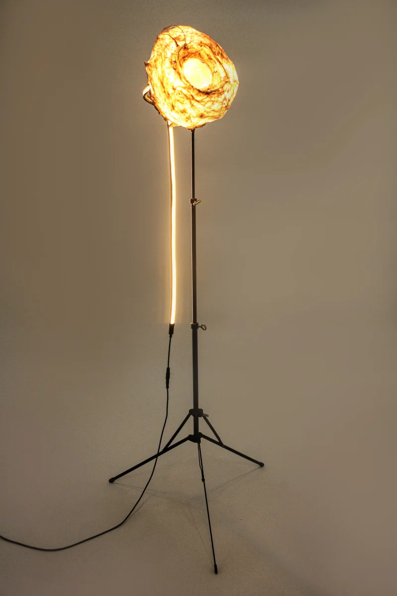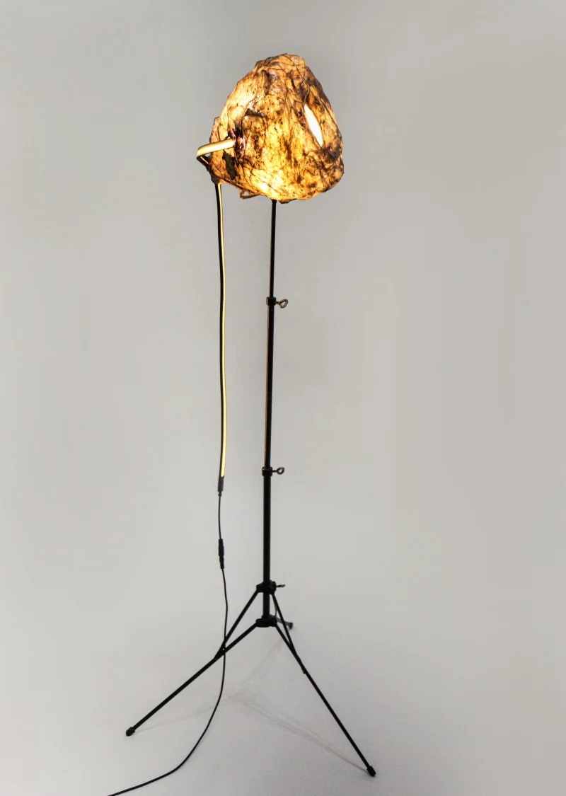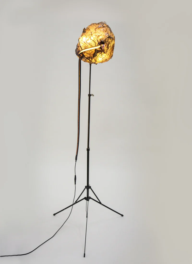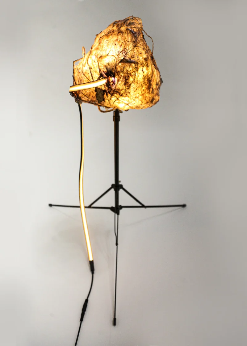 “Sympoietic” by Sabrina Merayo Nuñez intricately weaves the worlds of humans, non-humans, and technology, establishing a profound web of kinship. Drawing inspiration from both modern and medieval techniques, Sabrina has formulated a distinctive recipe for 100% biodegradable collagen-based bioplastic, reminiscent of ancient paint and adhesive preparations. Using this pioneering material, she fashions interactive lighting sculptures that engage with viewers through embedded motion sensors. These sculptures seamlessly incorporate carved artifacts, furniture fragments, veneers, and gleaming crystals.