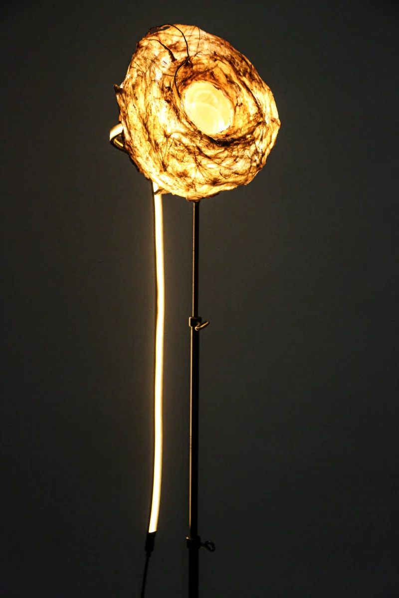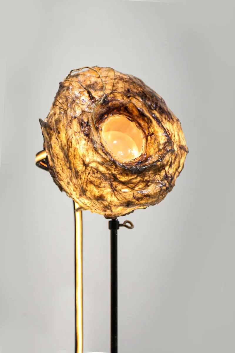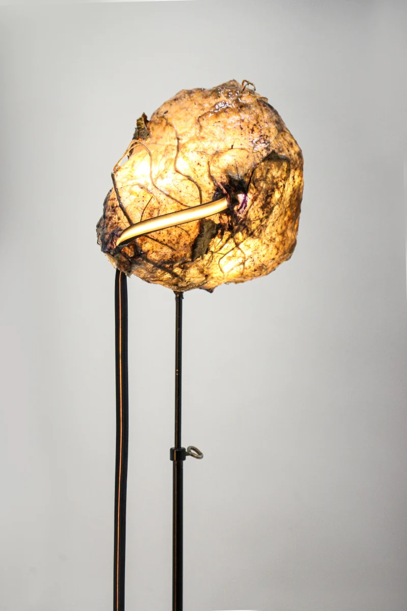 A standout within “Sympoietic” is the Microbiomes series. These lighting sculptures, crafted by Sabrina, encapsulate miniature ecosystems. Within the bioplastic forms lie tiny glass spheres filled with agar and roots, providing a nurturing space for microorganisms. As these micro-inhabitants thrive and evolve, they subtly alter the sculpture’s appearance, reflecting the organic behaviors of life within. Sabrina’s designs echo transformational encasements found in nature, like nests, chrysalises, and cocoons.