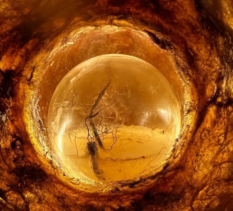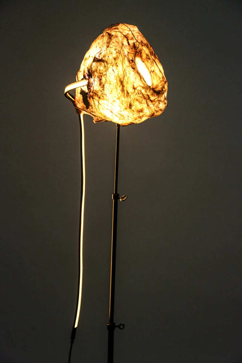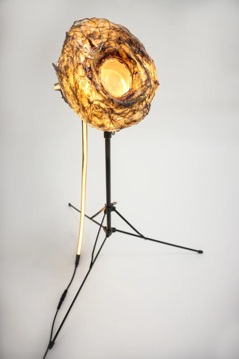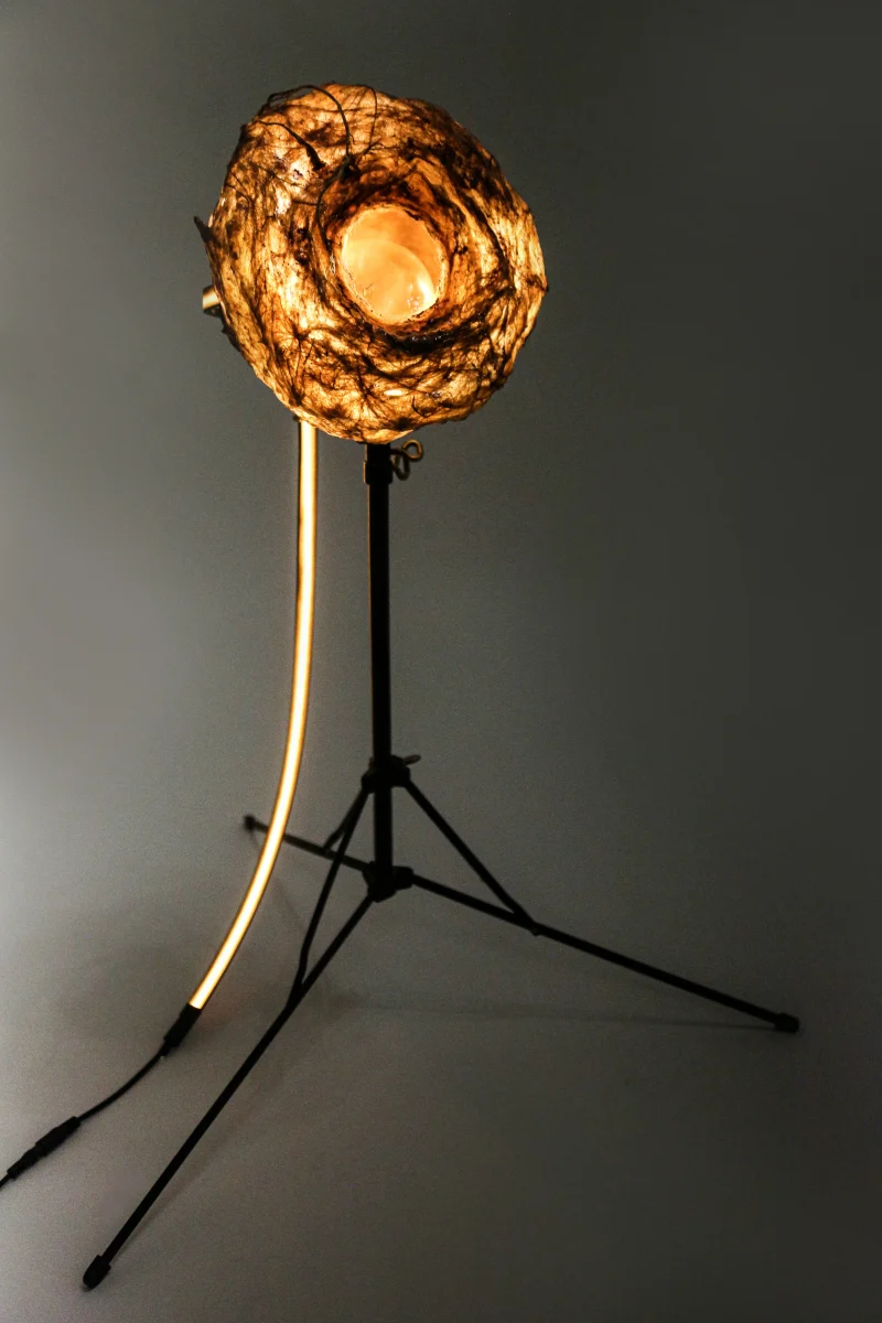 A standout within “Sympoietic” is the Microbiomes series. These lighting sculptures, crafted by Sabrina, encapsulate miniature ecosystems. Within the bioplastic forms lie tiny glass spheres filled with agar and roots, providing a nurturing space for microorganisms. As these micro-inhabitants thrive and evolve, they subtly alter the sculpture’s appearance, reflecting the organic behaviors of life within. Sabrina’s designs echo transformational encasements found in nature, like nests, chrysalises, and cocoons.