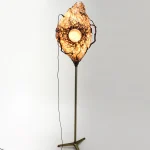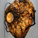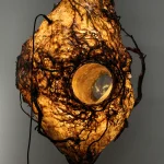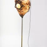 “Sympoietic” by Sabrina Merayo Nuñez intricately weaves the worlds of humans, non-humans, and technology, establishing a profound web of kinship. Drawing inspiration from both modern and medieval techniques, Sabrina has formulated a distinctive recipe for 100% biodegradable collagen-based bioplastic, reminiscent of ancient paint and adhesive preparations. Using this pioneering material, she fashions interactive lighting sculptures that engage with viewers through embedded motion sensors. These sculptures seamlessly incorporate carved artifacts, furniture fragments, veneers, and gleaming crystals.