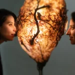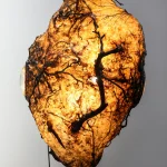 A standout within “Sympoietic” is the Microbiomes series. These lighting sculptures, crafted by Sabrina, encapsulate miniature ecosystems. Within the bioplastic forms lie tiny glass spheres filled with agar and roots, providing a nurturing space for microorganisms. As these micro-inhabitants thrive and evolve, they subtly alter the sculpture’s appearance, reflecting the organic behaviors of life within. Sabrina’s designs echo transformational encasements found in nature, like nests, chrysalises, and cocoons.
