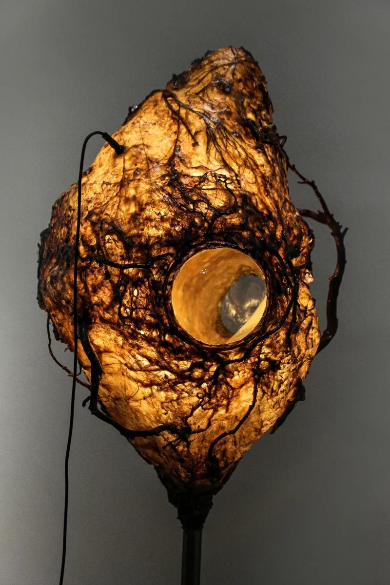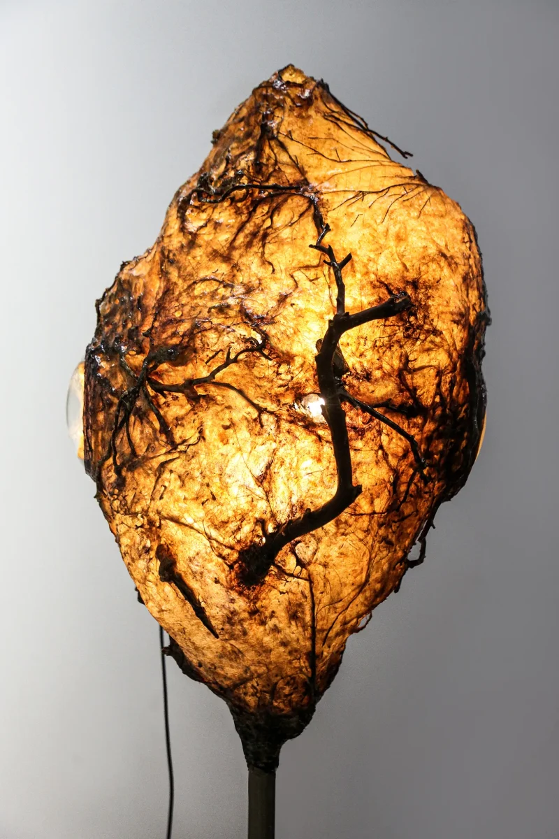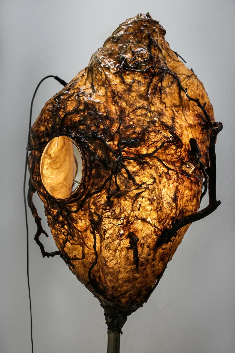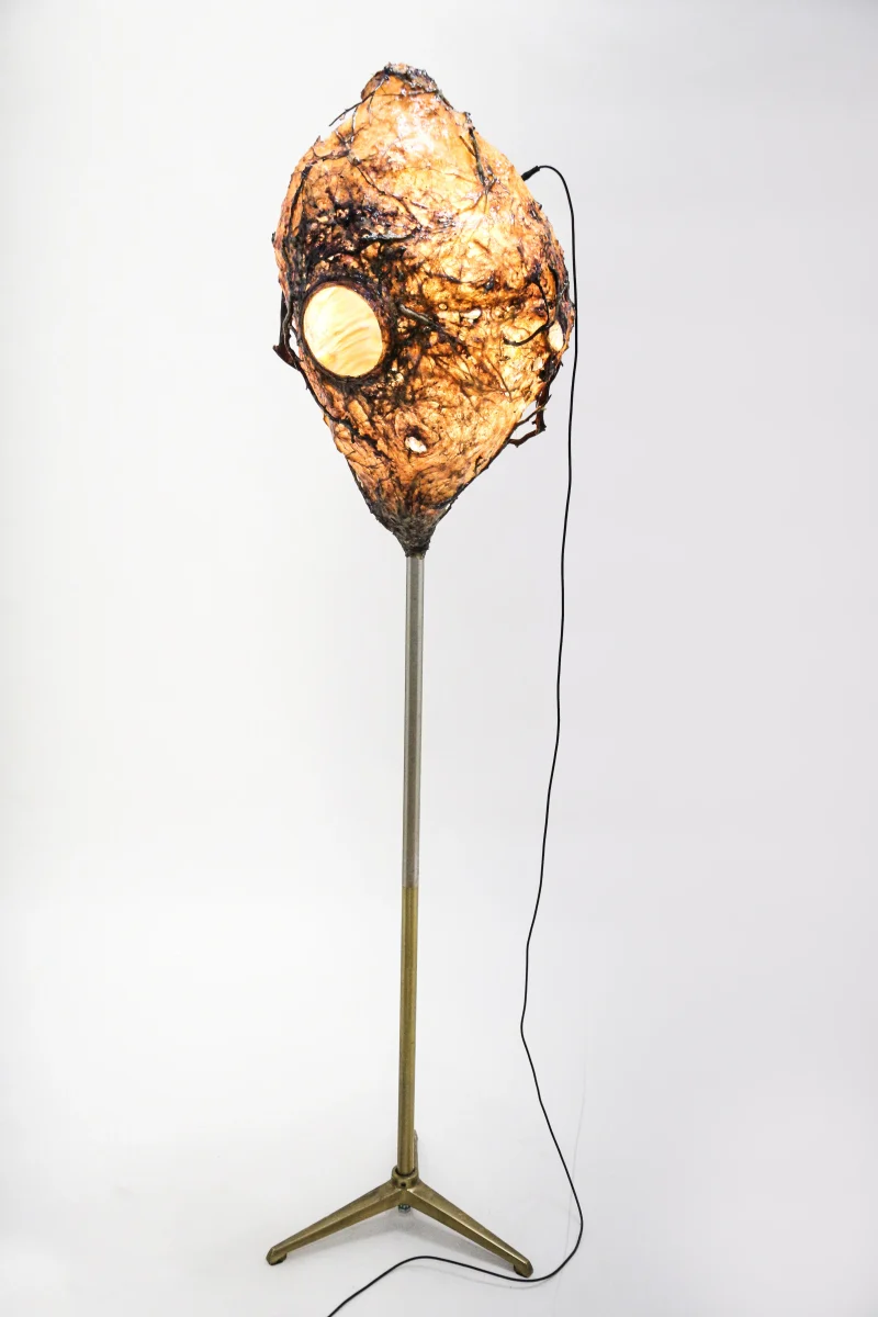 “Sympoietic” by Sabrina Merayo Nuñez intricately weaves the worlds of humans, non-humans, and technology, establishing a profound web of kinship. Drawing inspiration from both modern and medieval techniques, Sabrina has formulated a distinctive recipe for 100% biodegradable collagen-based bioplastic, reminiscent of ancient paint and adhesive preparations. Using this pioneering material, she fashions interactive lighting sculptures that engage with viewers through embedded motion sensors. These sculptures seamlessly incorporate carved artifacts, furniture fragments, veneers, and gleaming crystals.