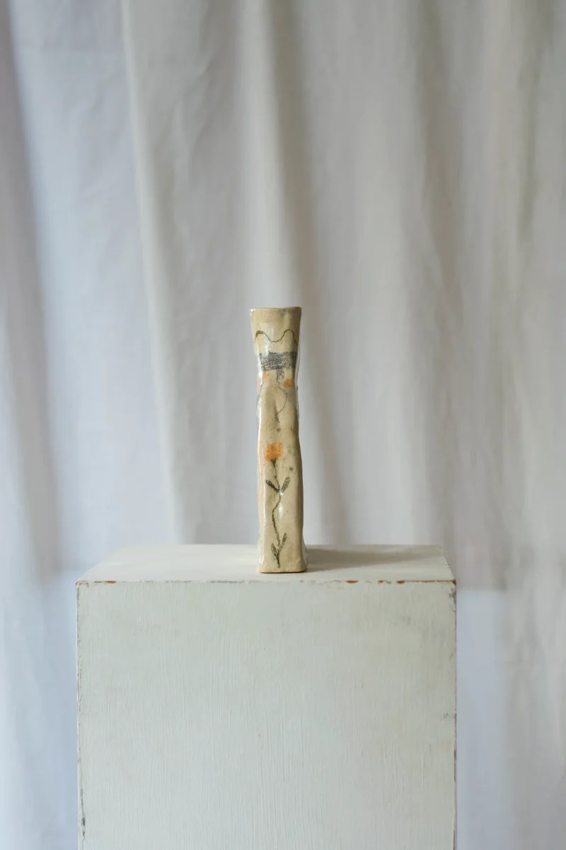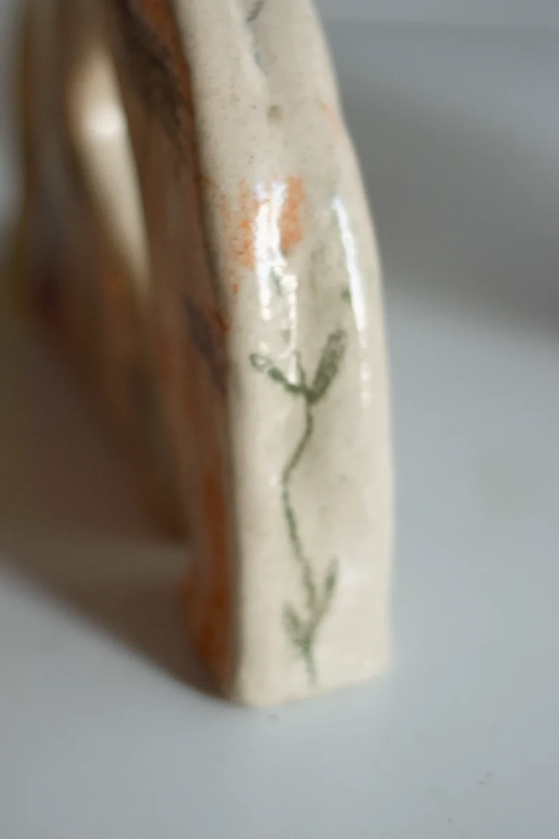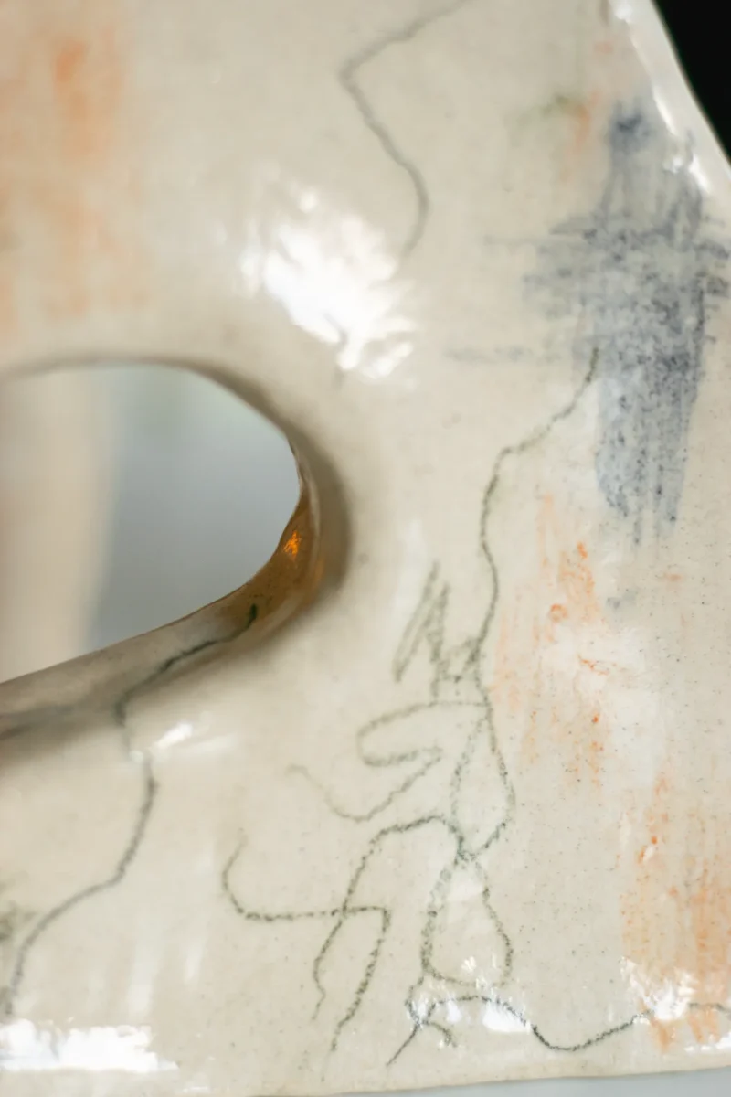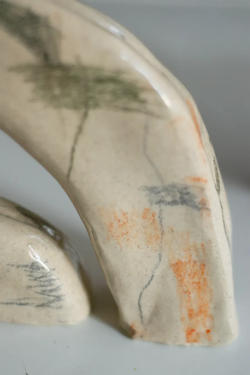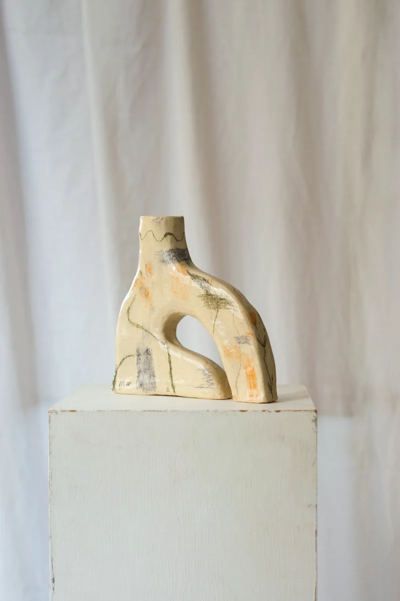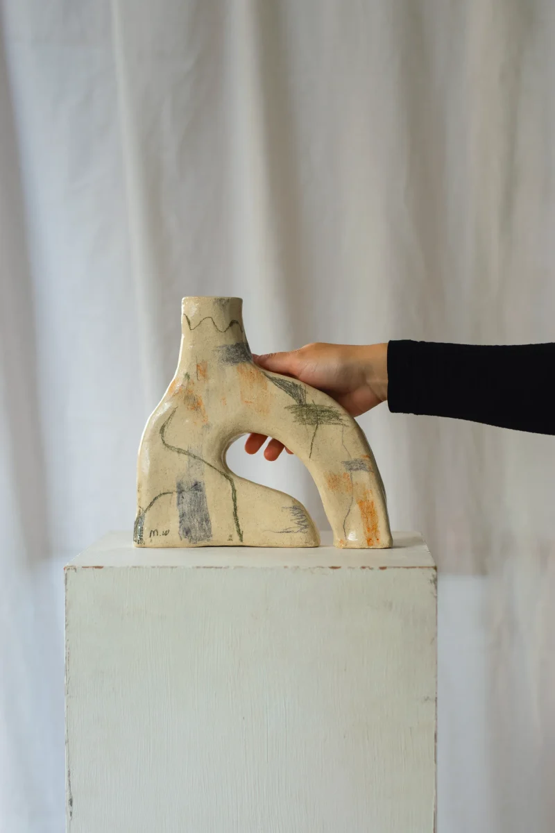 Midsummer’s Night by Mina Wright is a unique piece inspired by the iconic Shakespare’s comedy. Throughout the lines, we can see the reflection of shapes that portray nature itself. We used traditional ceramic techniques with clay. This vase is hand-painted with underglaze pencils and stoneware glaze.