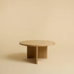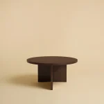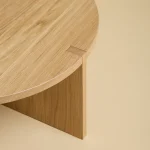 Its circular tabletop, characterized by its rich wood grain, is supported by two interlocking solid oak planks that form an innovative leg structure, combining structural stability with a sculptural design. The precision-cut plank gently pierces the tabletop, creating a sense of harmonious balance while showcasing expert woodworking techniques.