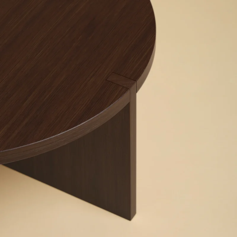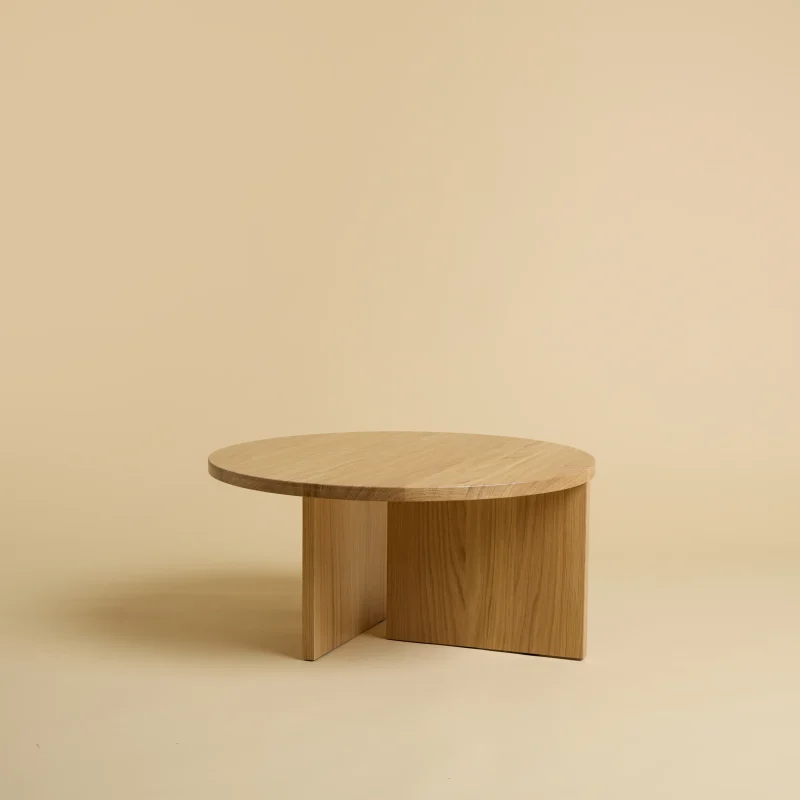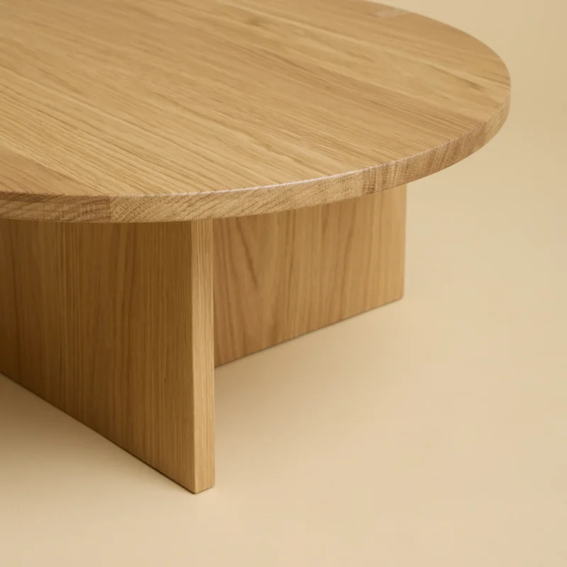 Its circular tabletop, characterized by its rich wood grain, is supported by two interlocking solid oak planks that form an innovative leg structure, combining structural stability with a sculptural design. The precision-cut plank gently pierces the tabletop, creating a sense of harmonious balance while showcasing expert woodworking techniques.