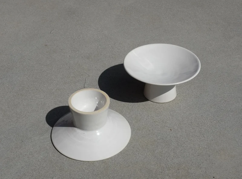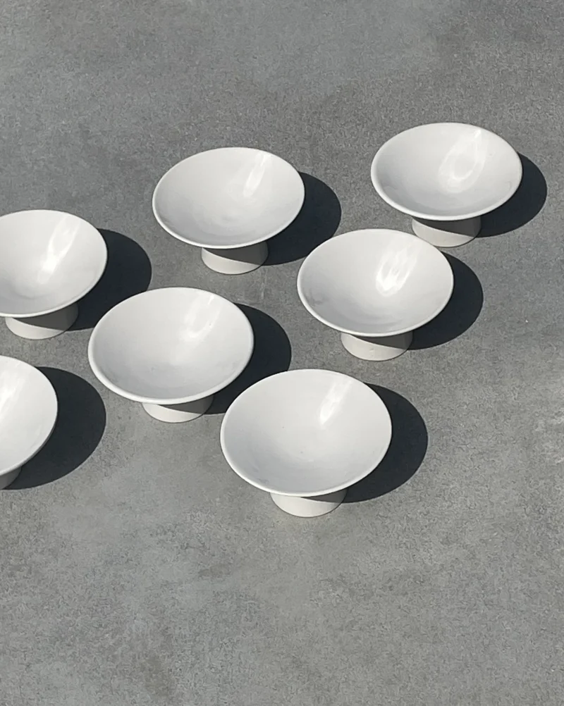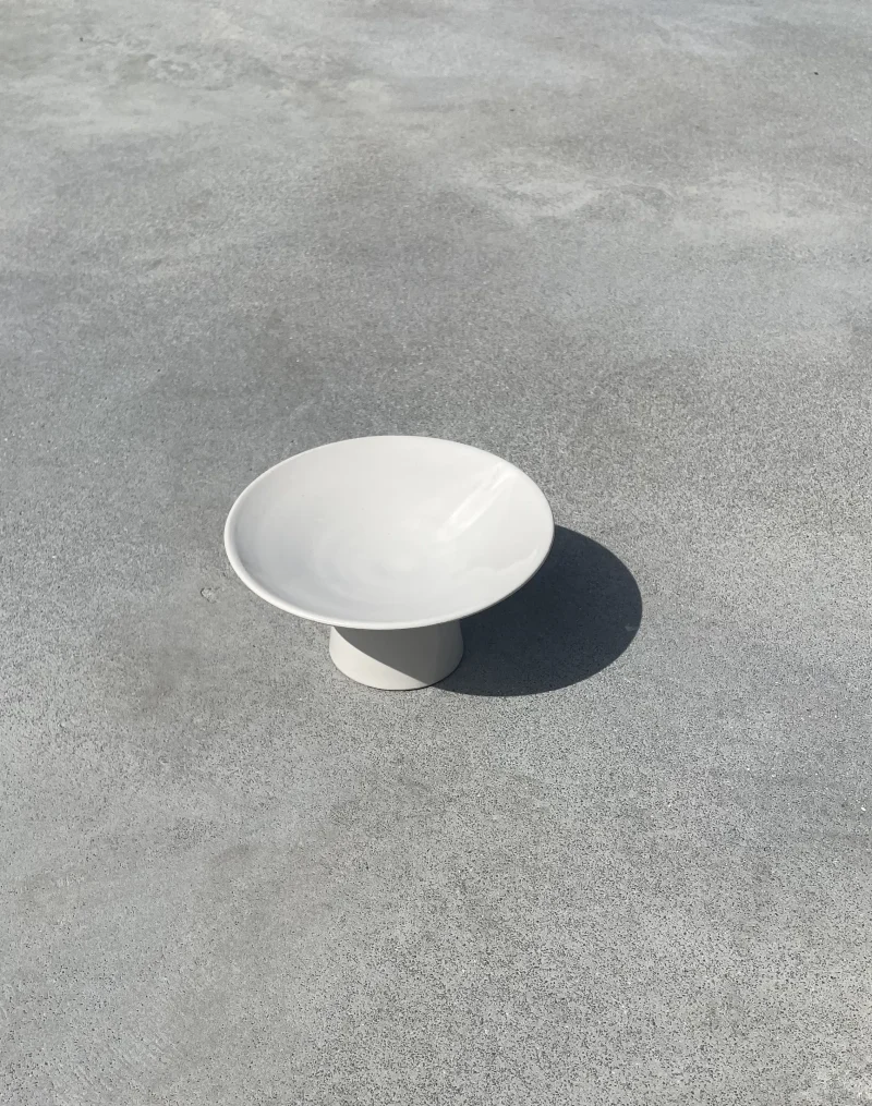 Fashioned with precision on a pottery wheel and finished with a white glaze, the small ceramic pedestal dish from ZANAMIZO is crafted to elevate the dining experience. Ideal for presenting desserts, small bites, or cherished objects, this dish brings both functionality and artistry to any table setting. Embracing the ethos of ‘ZA NA MIZO,’ translating to ‘for the table’ in Slovene, this piece embodies bold shapes that add a playful touch to the dining ambiance.