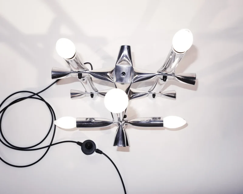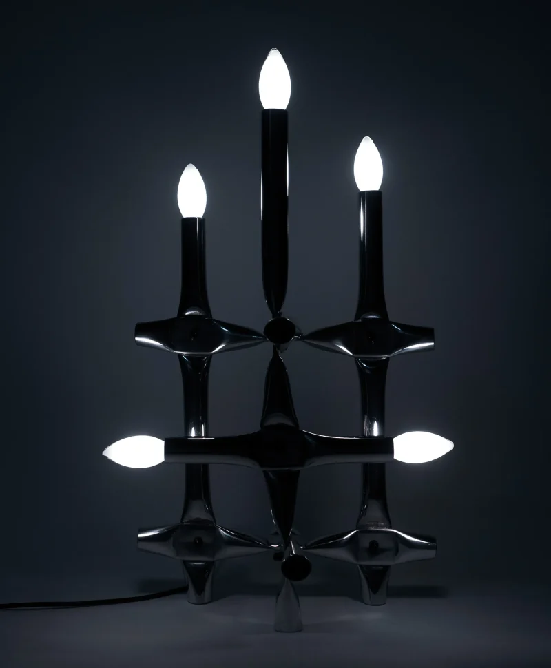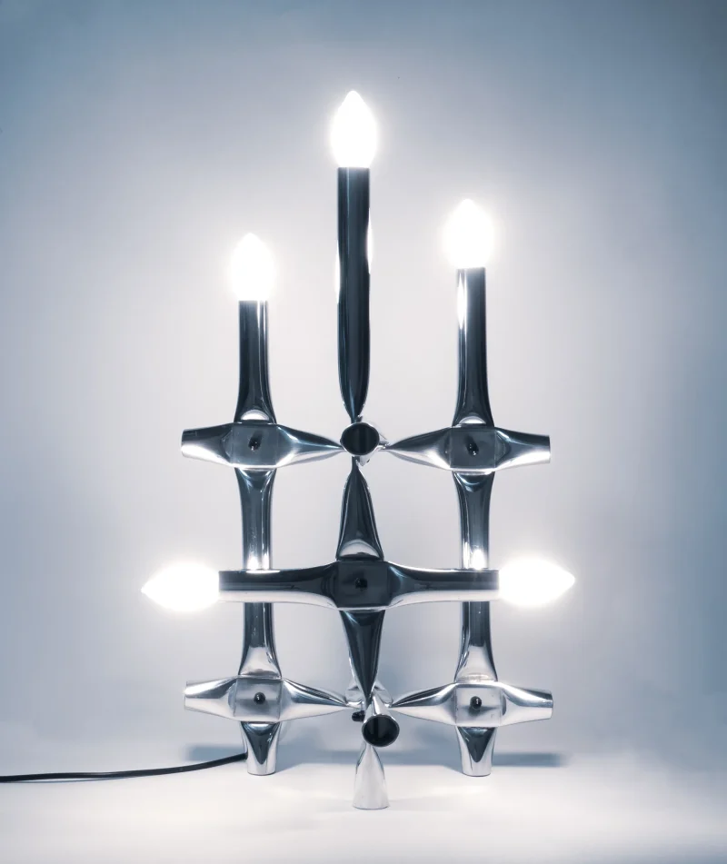 Miniquetschi by Thomas Waidhofer is a compact continuation of the Quetschi series, following the same conceptual approach but using slimmer 30mm aluminum tubes instead of 50mm. Like its larger counterpart, Miniquetschi is built around crimped cross connections—where deformation serves both structural and aesthetic purposes. The joints add stability, define shape, and function as unique stylistic elements. Manufactured with a custom-built press, the crimping process generates high tension in the material, often resulting in cracks or fractures that are embraced as part of the object’s character. Unlike the original Quetschi, however, the electrical wiring in Miniquetschi is hidden—offering a cleaner, more compact form while still preserving the raw and expressive nature of the series.