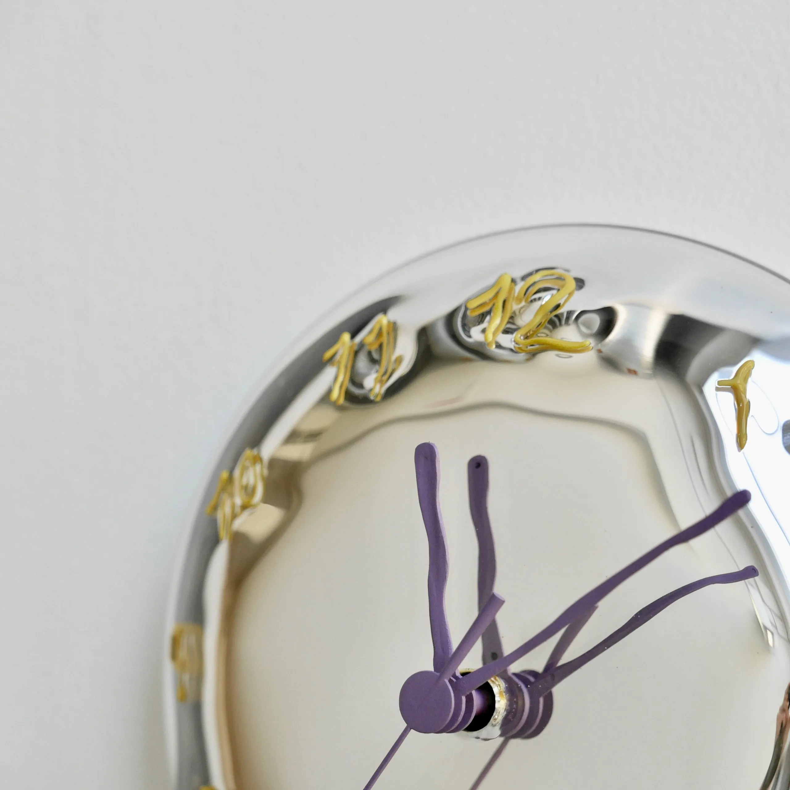 Mirror Clock is mouth-blown and shaped in fluid clear glass. The numbers are written on the dial while still hot.
