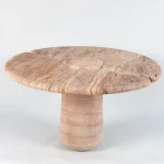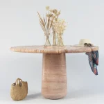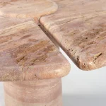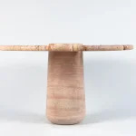 Part of the “Mistral Collection” this dining table is hand carved out of solid Travertino Rosso and meticulously put together by master craftsmen. Centrally supported and defying its material limitations, the “Mistral Dining Table” plays on the contrast of heavy and light. With a prominent split down the center of the table, the top floats on either side of its monumental base, giving an airy feel to an otherwise solid material.