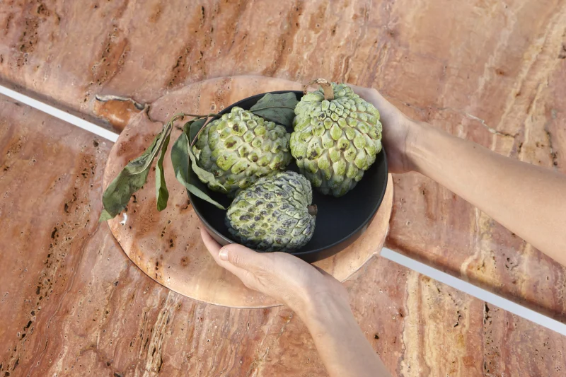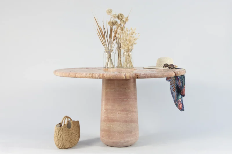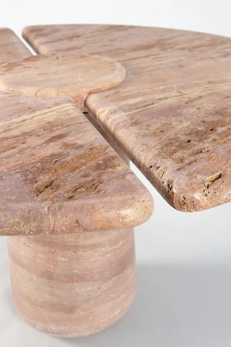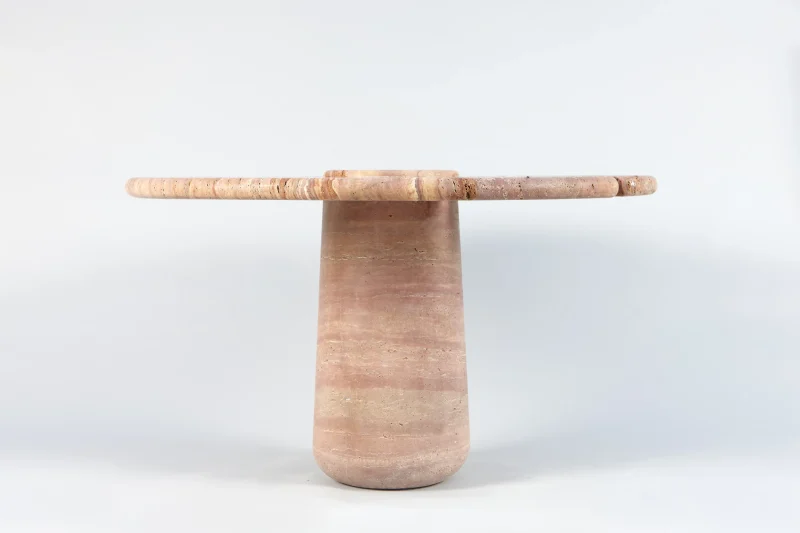Part of the “Mistral Collection” this dining table is hand carved out of solid Travertino Rosso and meticulously put together by master craftsmen. Centrally supported and defying its material limitations, the “Mistral Dining Table” plays on the contrast of heavy and light. With a prominent split down the center of the table, the top floats on either side of its monumental base, giving an airy feel to an otherwise solid material.