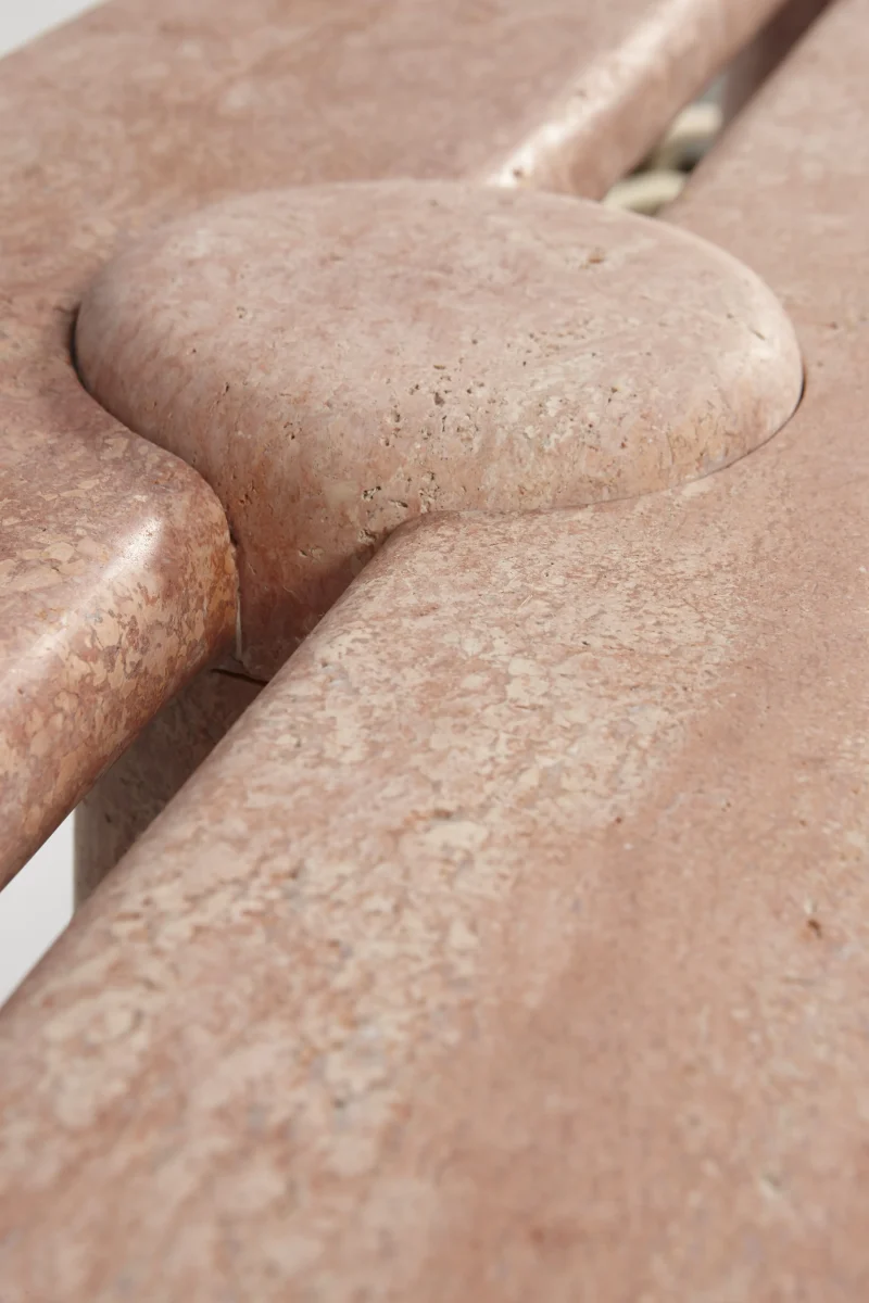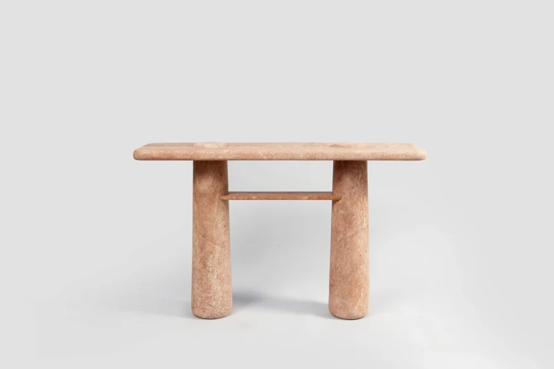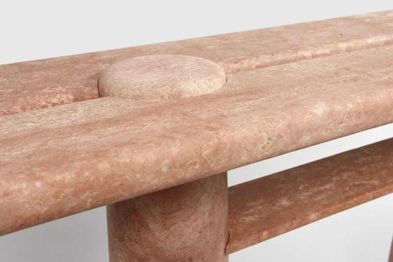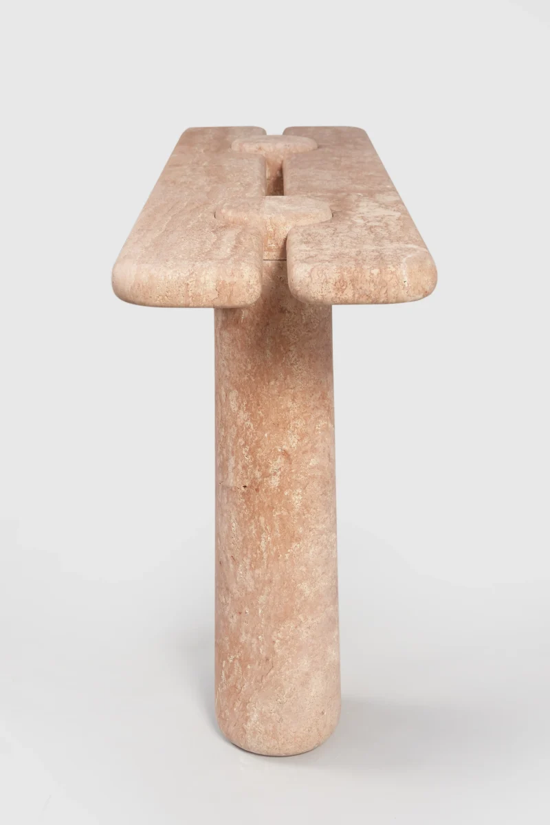 Part of the “Mistral Collection” this console table is hand-carved out of solid Pink Travertino blocks and meticulously put together by master craftsmen. Carefully molded by hand, as if slowly eroded by nature through the passing of time, the “Mistral Console” stands elegantly on two tapering monolithic columns that puncture an organic top, accentuating the slenderness of the sculptural yet functional piece. This version also includes a secondary marble shelf, adorned between its columns.