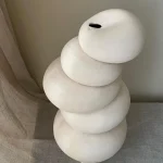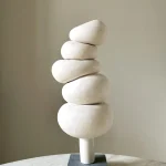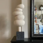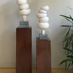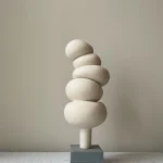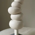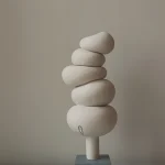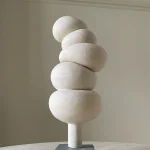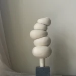 This ceramic sculpture by Françoise Jeffrey Ceramics features off-white earthenware delicately perched on a green natural stone base crafted from Dolomite, securely attached with a metal pin. Embracing a soft minimalist aesthetic, it exudes a calming presence, reminiscent of stacked stones in a Zen garden.
