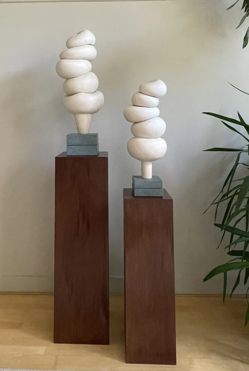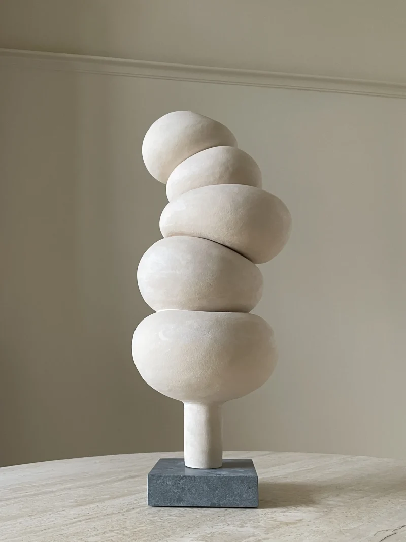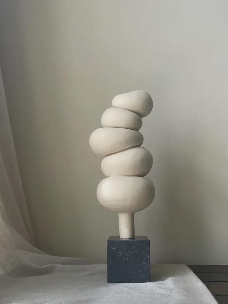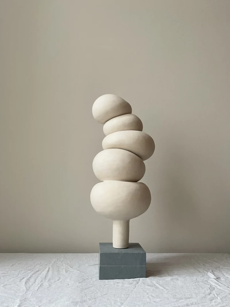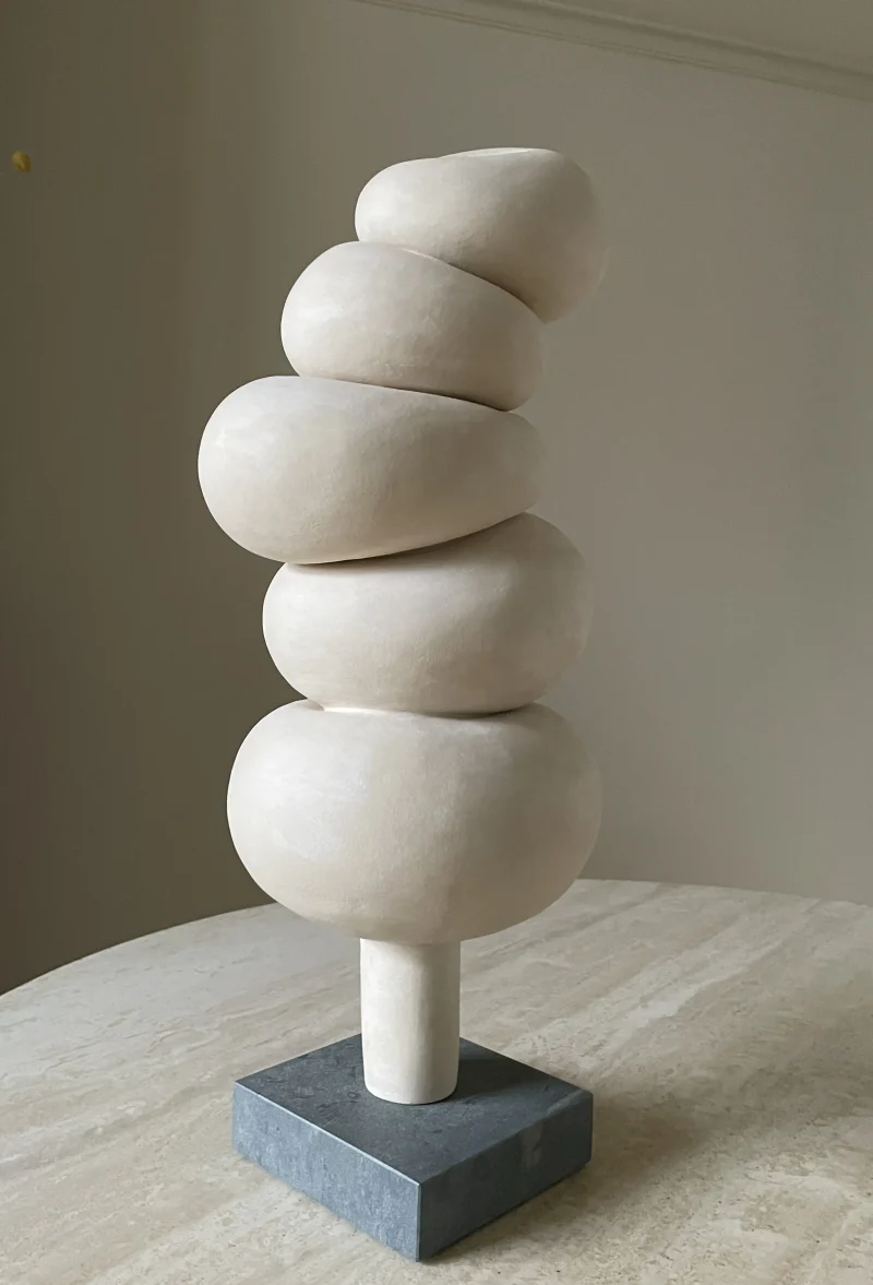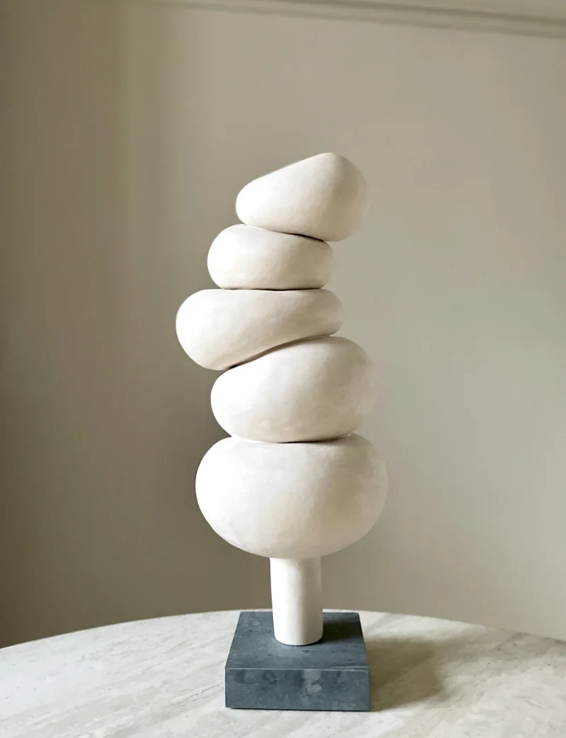 This ceramic sculpture by Françoise Jeffrey Ceramics features off-white earthenware delicately perched on a green natural stone base crafted from Dolomite, securely attached with a metal pin. Embracing a soft minimalist aesthetic, it exudes a calming presence, reminiscent of stacked stones in a Zen garden.
