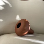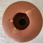 This soft ceramic sculpture, crafted from stoneware in a rust-brown hue, features gently flowing lines that enhance its serene presence. The piece is graced with subtle touches of gold on top, following the Japanese Kintsugi tradition, symbolizing beauty in imperfection.