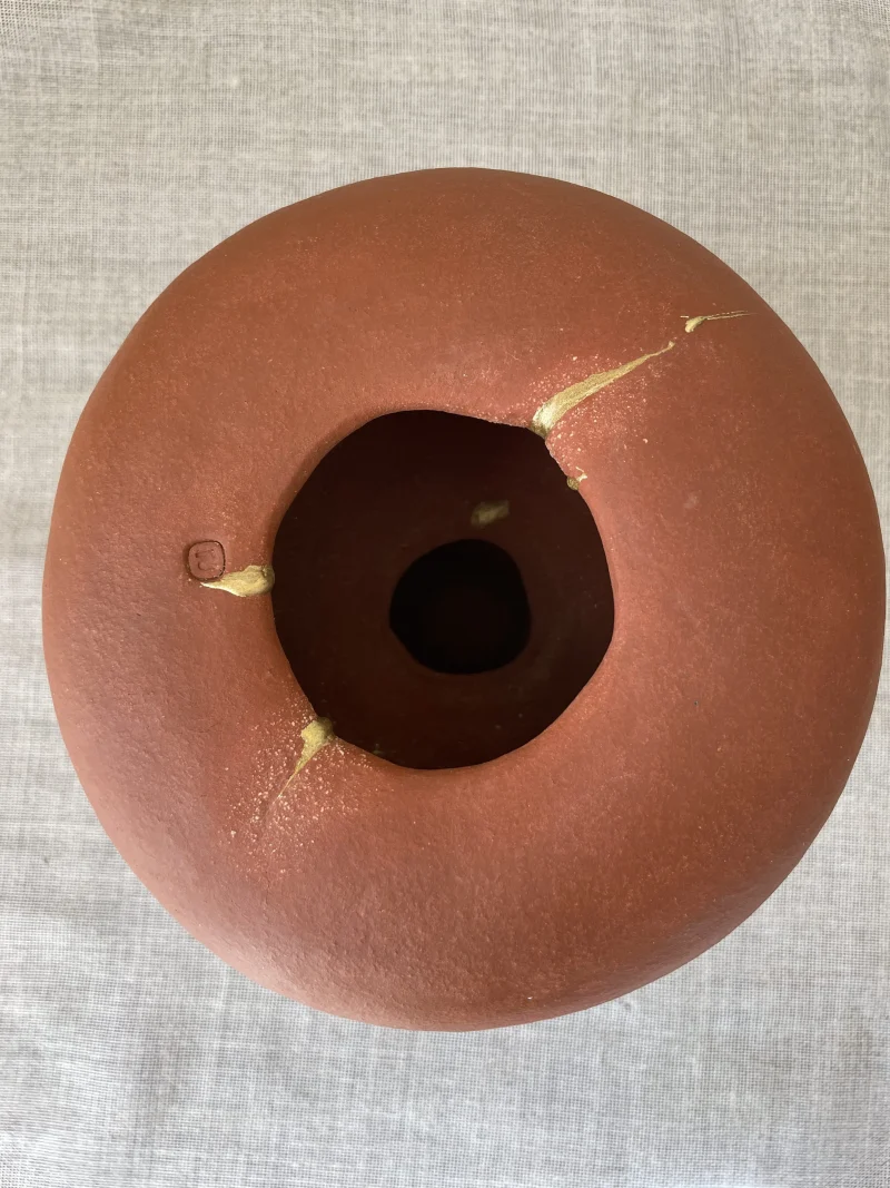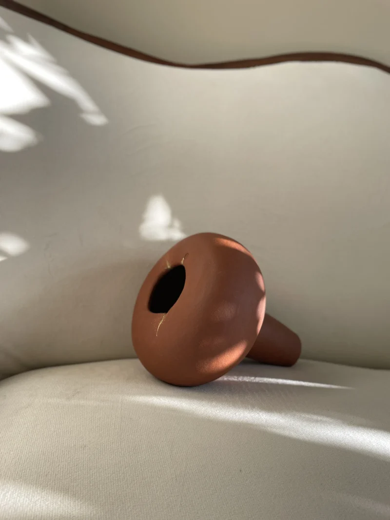This soft ceramic sculpture, crafted from stoneware in a rust-brown hue, features gently flowing lines that enhance its serene presence. The piece is graced with subtle touches of gold on top, following the Japanese Kintsugi tradition, symbolizing beauty in imperfection.