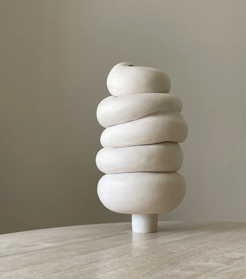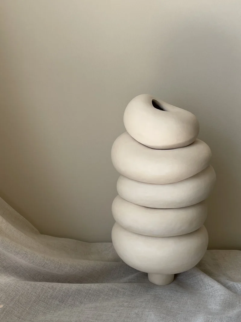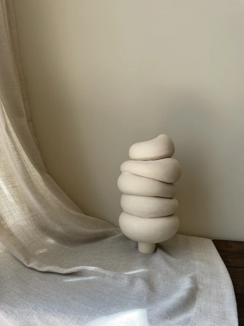 This ceramic sculpture by Françoise Jeffrey Ceramics features off-white earthenware. Embracing a soft minimalist aesthetic, it exudes a calming presence, reminiscent of stacked stones in a Zen garden.