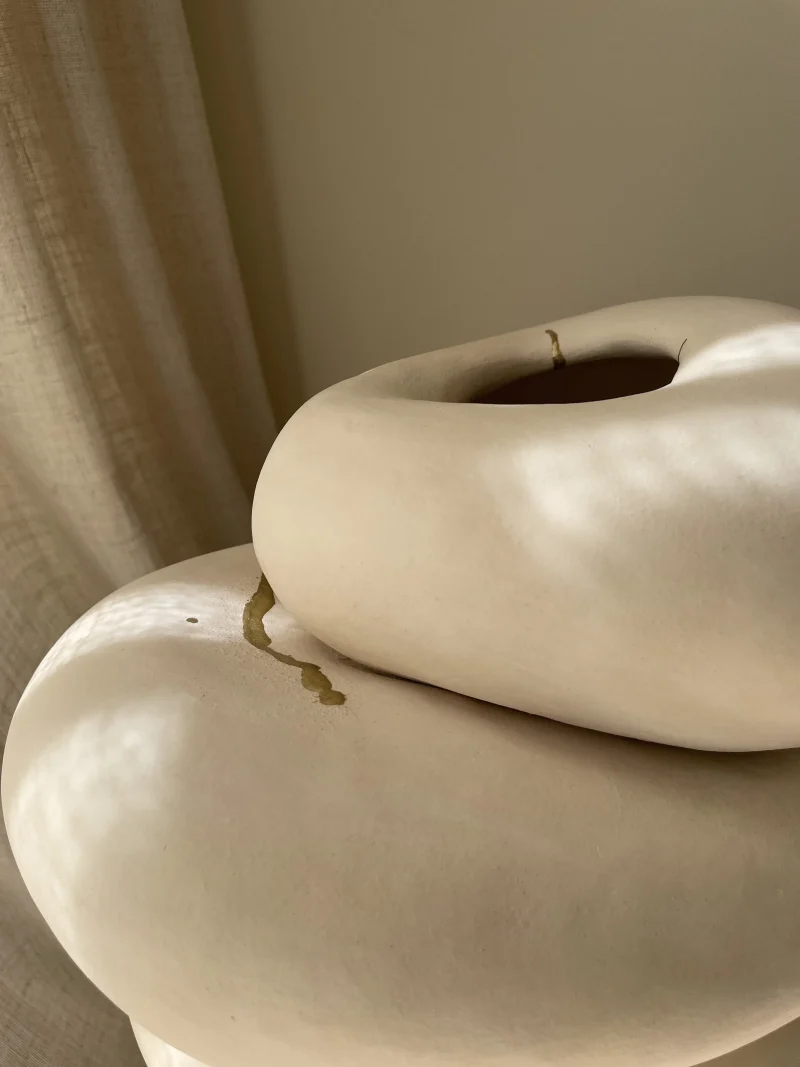 This ceramic sculpture by Françoise Jeffrey Ceramics features off-white earthenware. Embracing a soft minimalist aesthetic, it exudes a calming presence, reminiscent of stacked stones in a Zen garden. Blessed by some touches of gold inspired by the Japanese Kintsugi tradition, embracing the beauty of imperfection.
