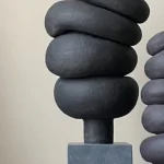 This ceramic sculpture by Françoise Jeffrey Ceramics features black stoneware delicately perched on a Begian stone base, securely attached with a metal pin. Embracing a soft minimalist aesthetic, it exudes a calming presence, reminiscent of stacked stones in a Zen garden.