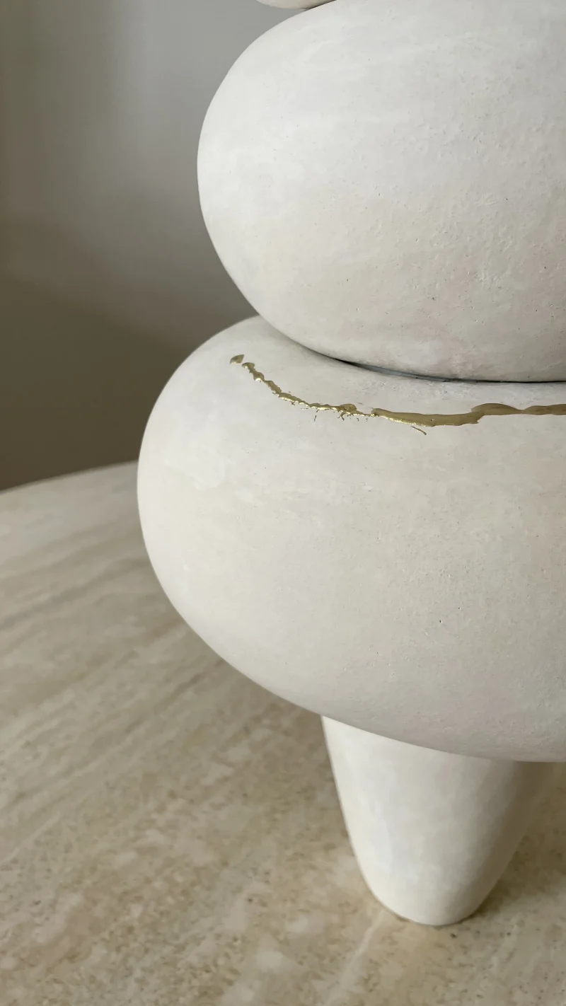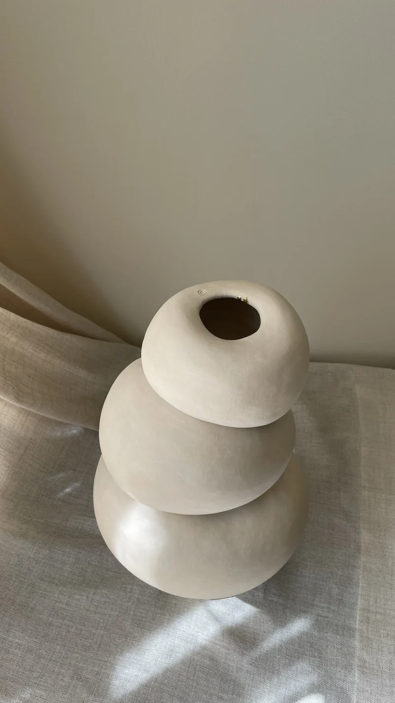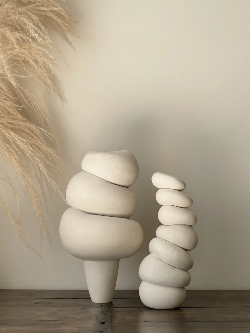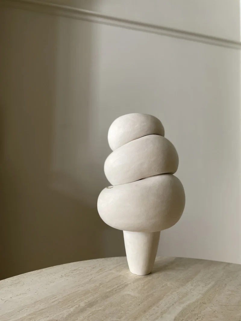 This ceramic sculpture features off-white earthenware, embracing a soft minimalist aesthetic, it exudes a calming presence, reminiscent of stacked stones in a Zen garden.