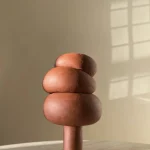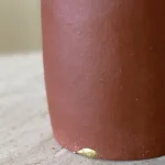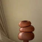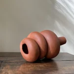 This soft minimalist ceramic sculpture, crafted from stoneware in a rust-brown hue, features gently flowing lines that enhance its serene presence. The piece is graced with a subtle touch of gold on its foot, following the Japanese Kintsugi tradition, symbolizing beauty in imperfection.