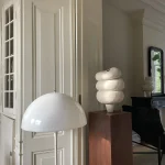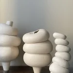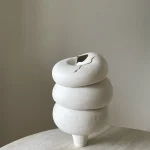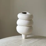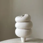 This ceramic sculpture features off-white earthenware. The piece is graced with a subtle touch of gold on its foot, following the Japanese Kintsugi tradition, symbolizing beauty in imperfection. Embracing a soft minimalist aesthetic, it exudes a calming presence, reminiscent of stacked stones in a Zen garden.