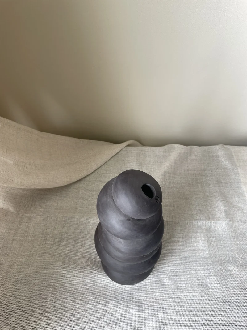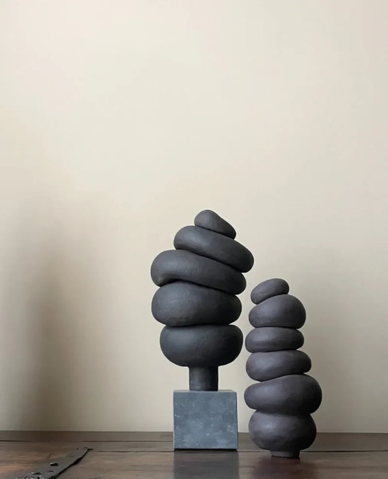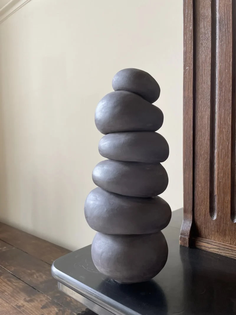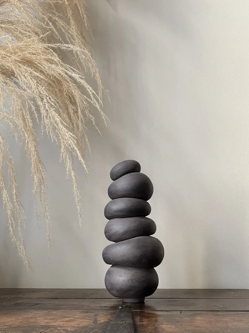 This ceramic sculpture by Françoise Jeffrey Ceramics features black stoneware. Embracing a soft minimalist aesthetic, it exudes a calming presence, reminiscent of stacked stones in a Zen garden.