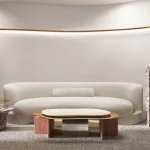 The accent of the sofa is a central insertion with natural stone or wood coated with glossy enamel.