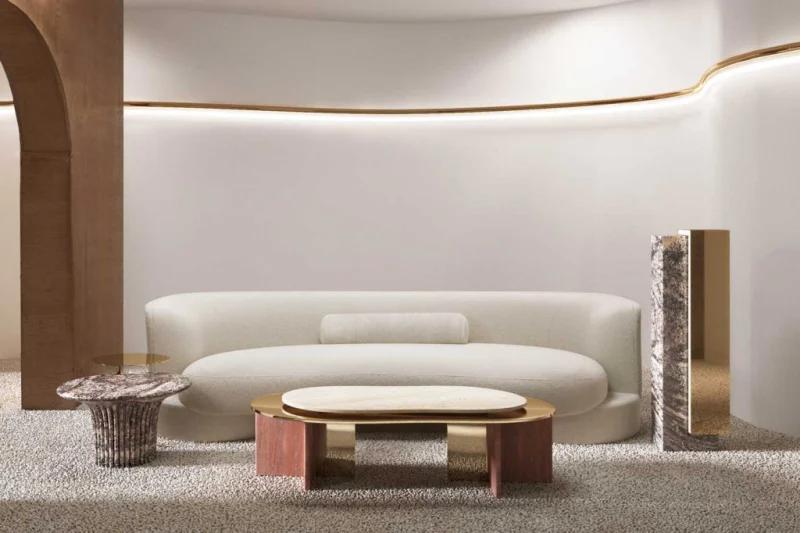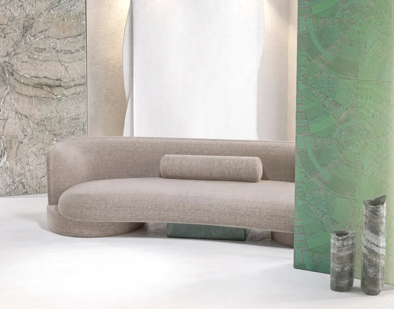 The accent of the sofa is a central insertion with natural stone or wood coated with glossy enamel.