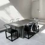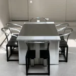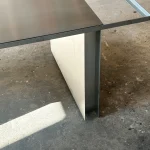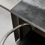 The table top (230x100cm) is integrated into a stainless steel frame attached to both brushed stainless steel legs with a 10cm overhang to the inner connecting plate. this design creates a light and linear visual language.