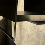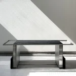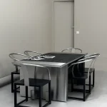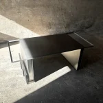 Made from 2 mm thick brushed stainless steel plates, the table has a precise silhouette defined by the free-standing, slender leg plates, which offer a sculptural presence and visual lightness at the same time.