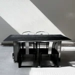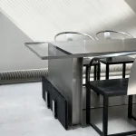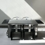 This Dining Table consists of a double-layered, brushed stainless steel body with inlaid black wood elements and was designed modularly for maximum flexibility.