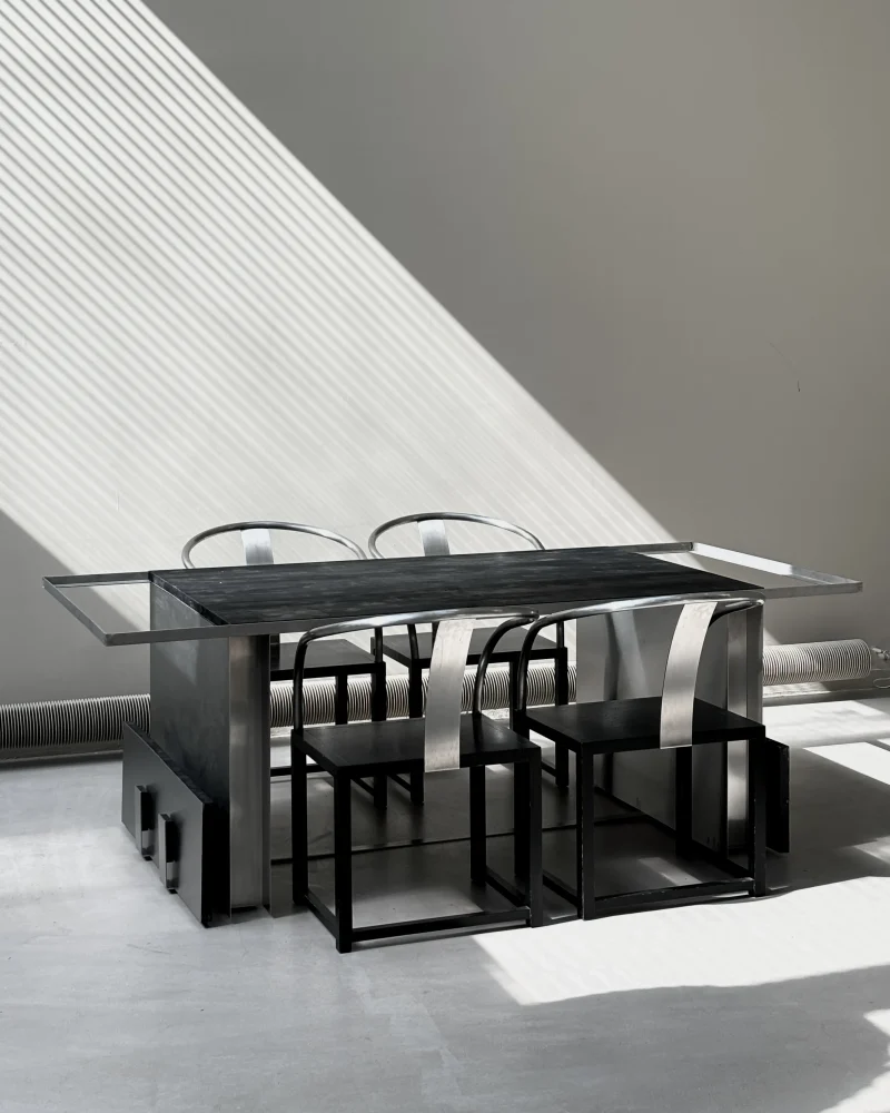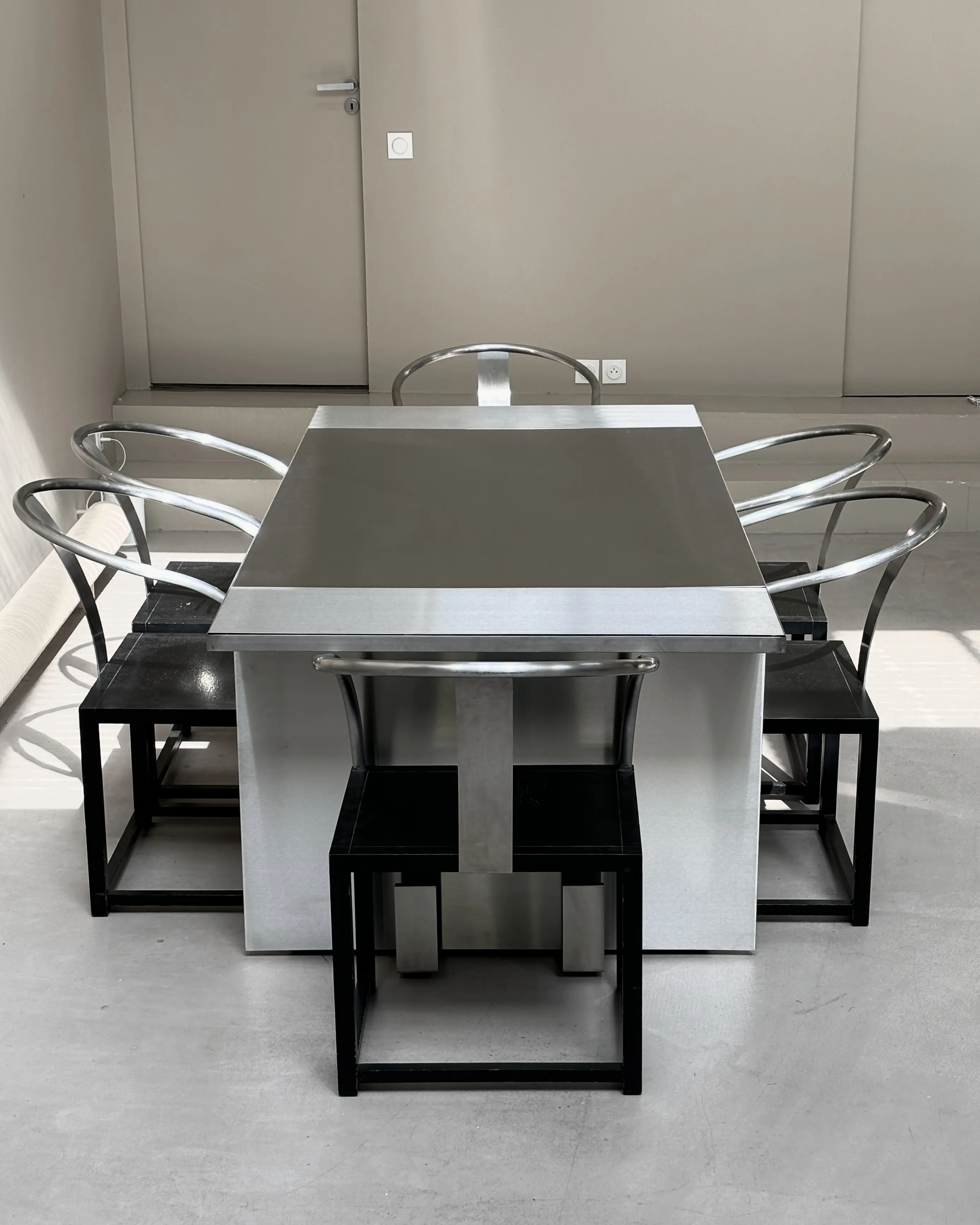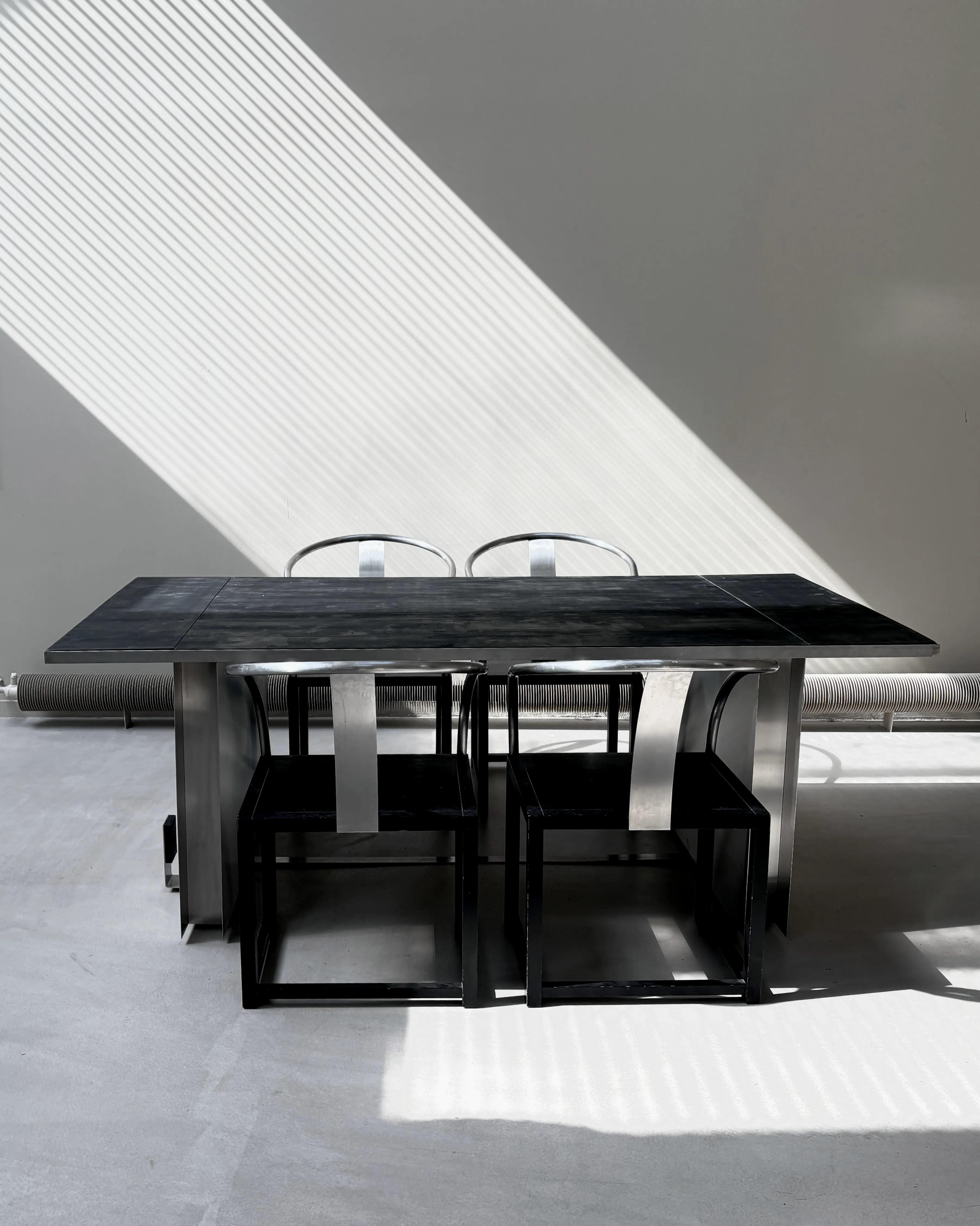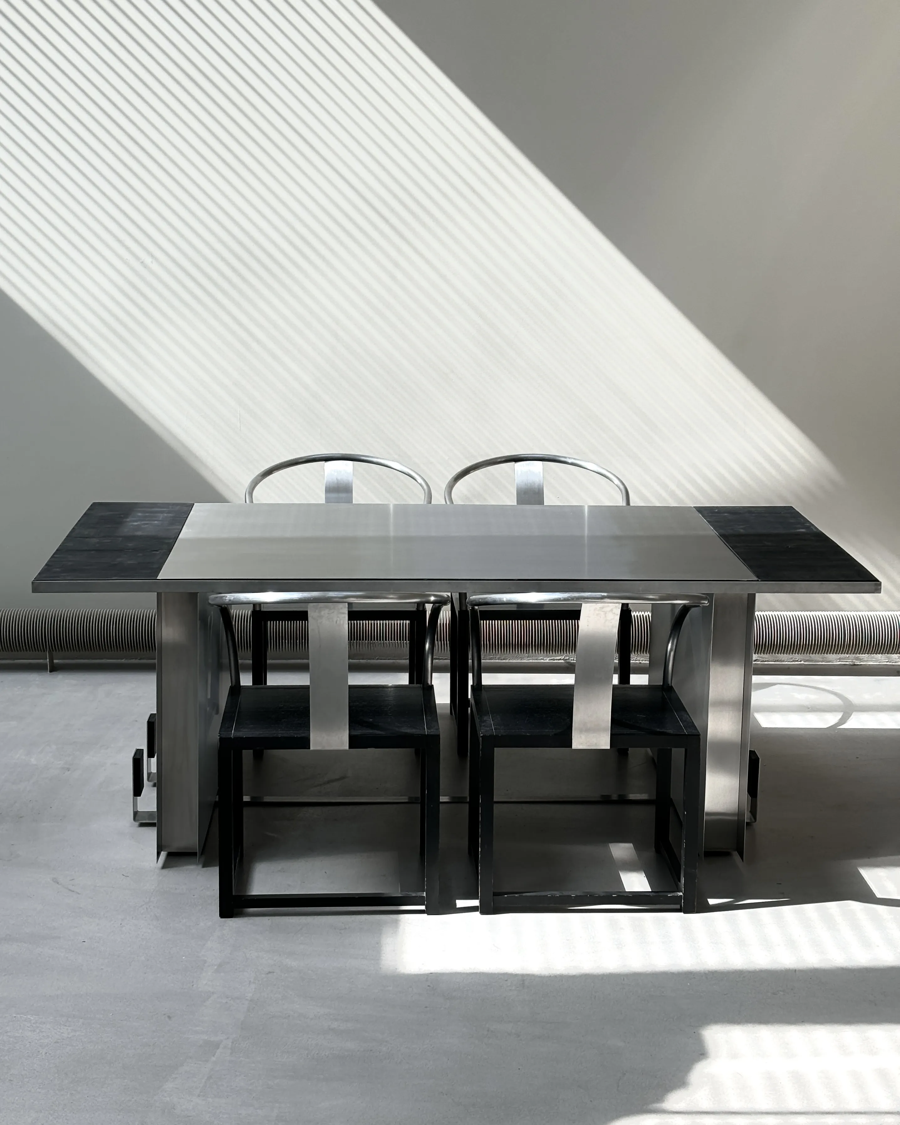 This Dining Table consists of a double-layered, brushed stainless steel body with inlaid black wood elements and was designed modularly for maximum flexibility.