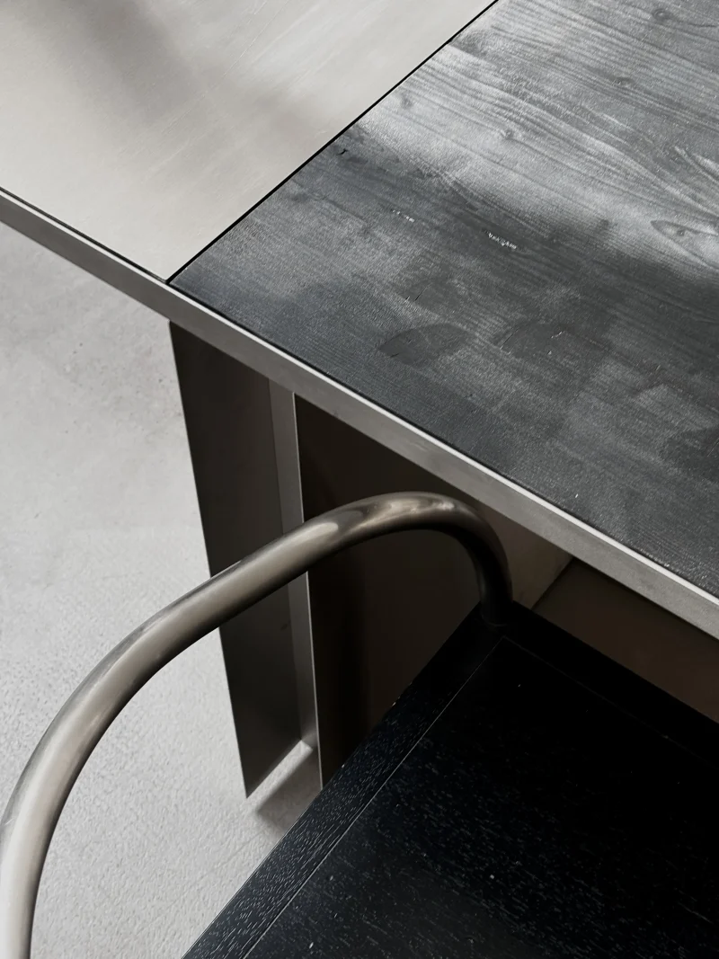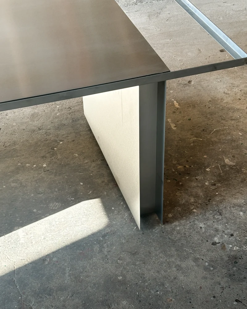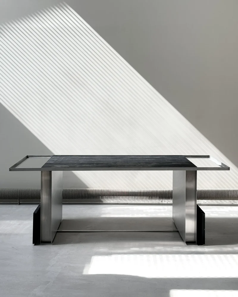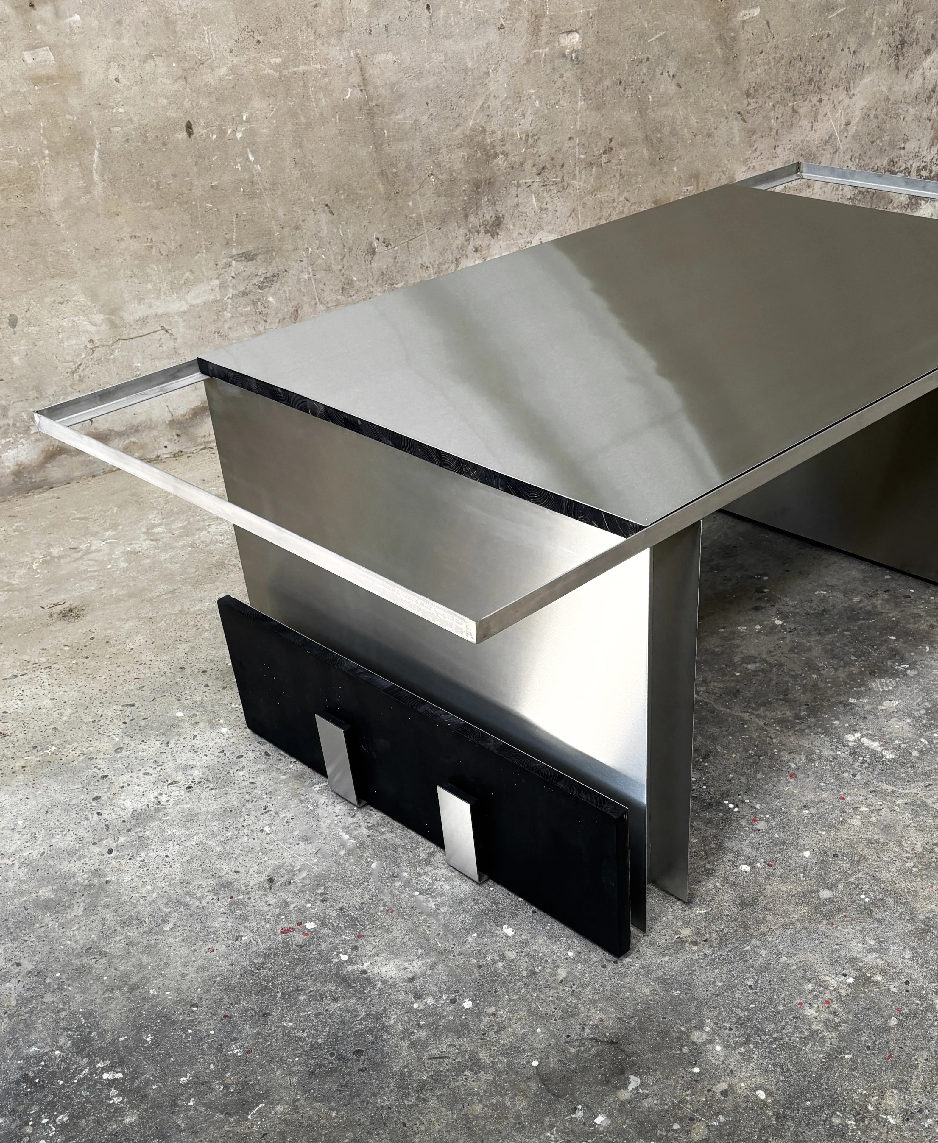 The table top (230x100cm) is integrated into a stainless steel frame attached to both brushed stainless steel legs with a 10cm overhang to the inner connecting plate. this design creates a light and linear visual language.