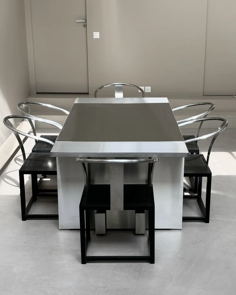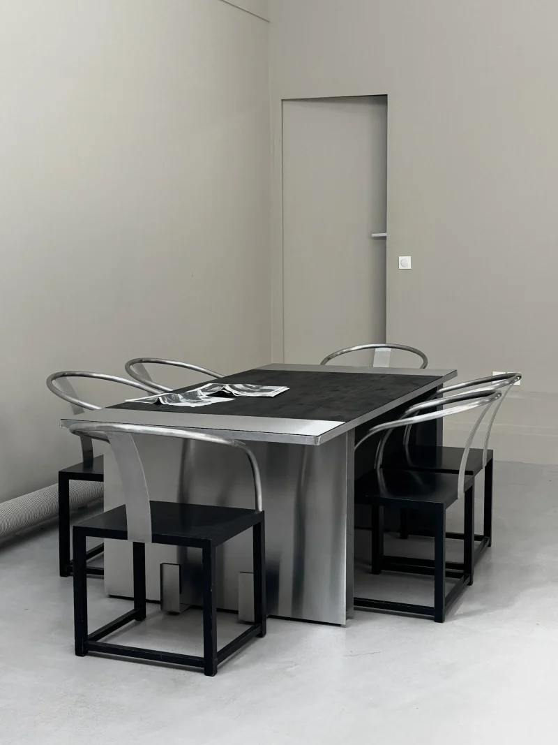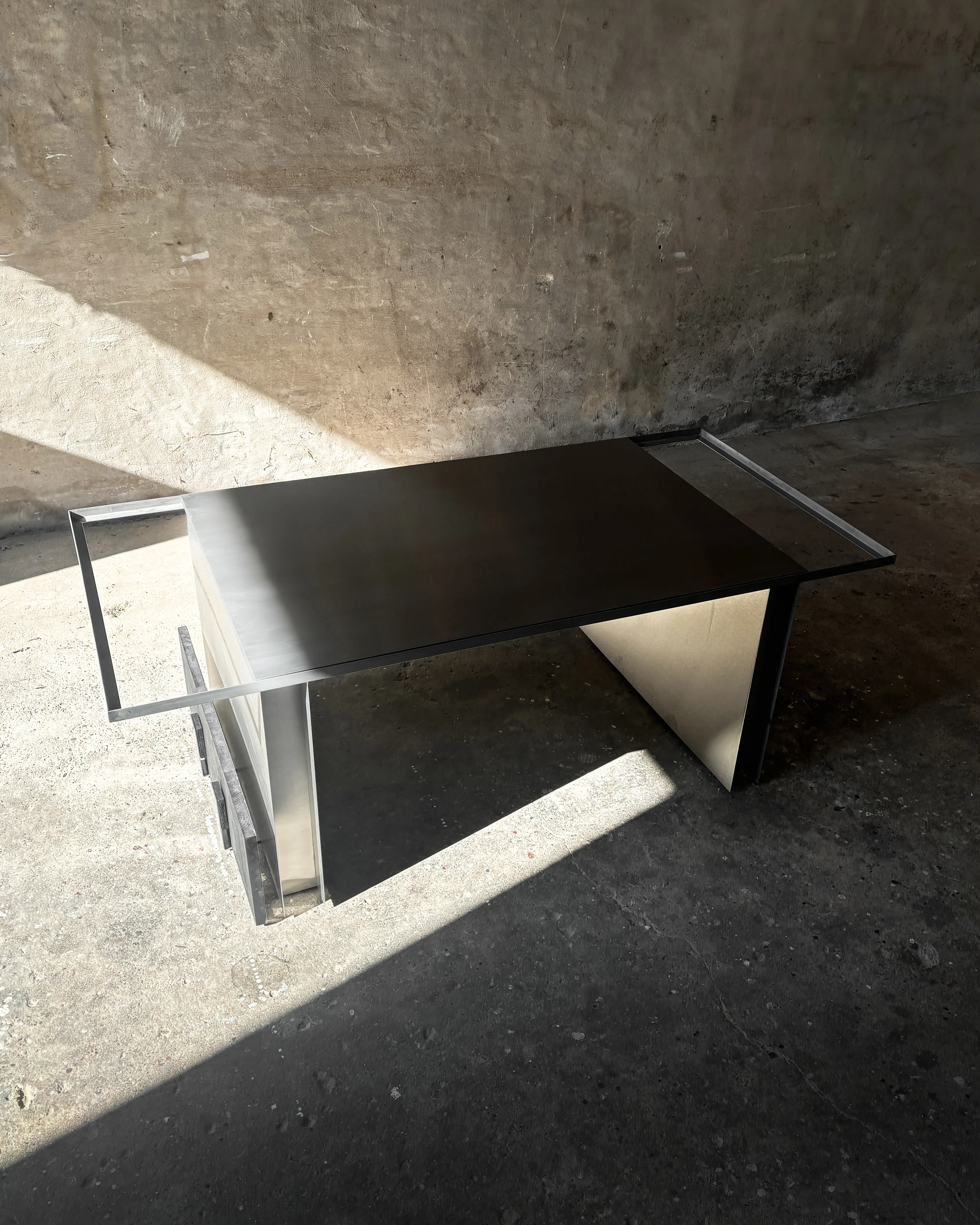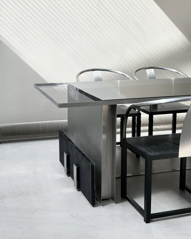 Made from 2 mm thick brushed stainless steel plates, the table has a precise silhouette defined by the free-standing, slender leg plates, which offer a sculptural presence and visual lightness at the same time.