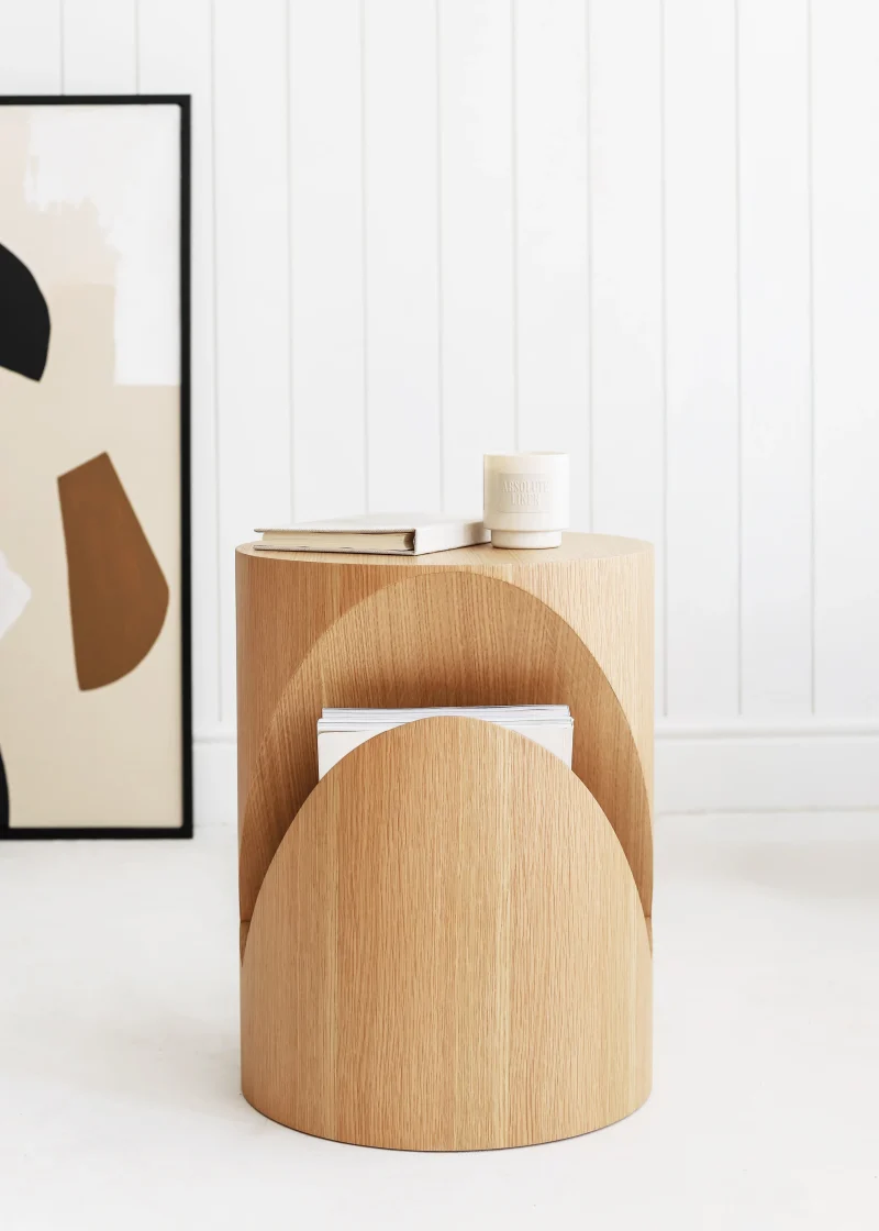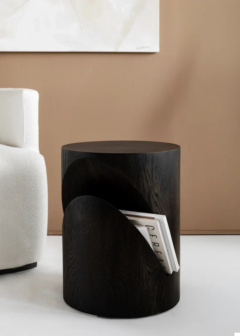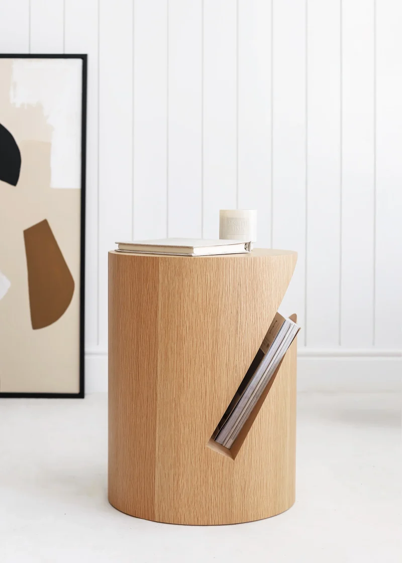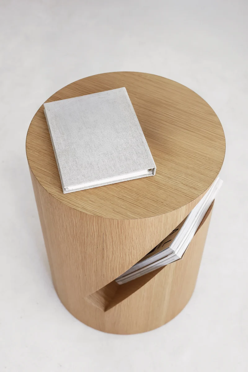 The Mola side table by Yet Design Studio is made of solid oak veneer/plywood and can be used both as a side table and a nightstand. The chamber in the body is designed as a newspaper/magazine holder, giving the product a different function. It is a product where you can feel the texture, warmth and naturalness of wood in the most effective way. Due to the unique structure of each tree, each product may have a different texture, vein structure, pattern and tone. These are the features that reflect the naturalness of the tree. It is handcrafted using natural methods by local artisans.