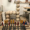 The “Molecule Chair” is made of 36 hand-turned wooden spheres with a hidden steel structure that serves as the base and holds all of the spheres together. The final product has been painted light grey, laquered, and later polished by hand.