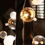 The Molecule Floor Lamp features a crumpled stainless steel body and blown glass balls in clear and frosted finishes. It is customizable in color and finish.
