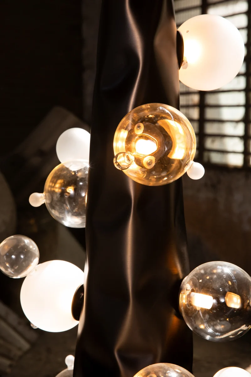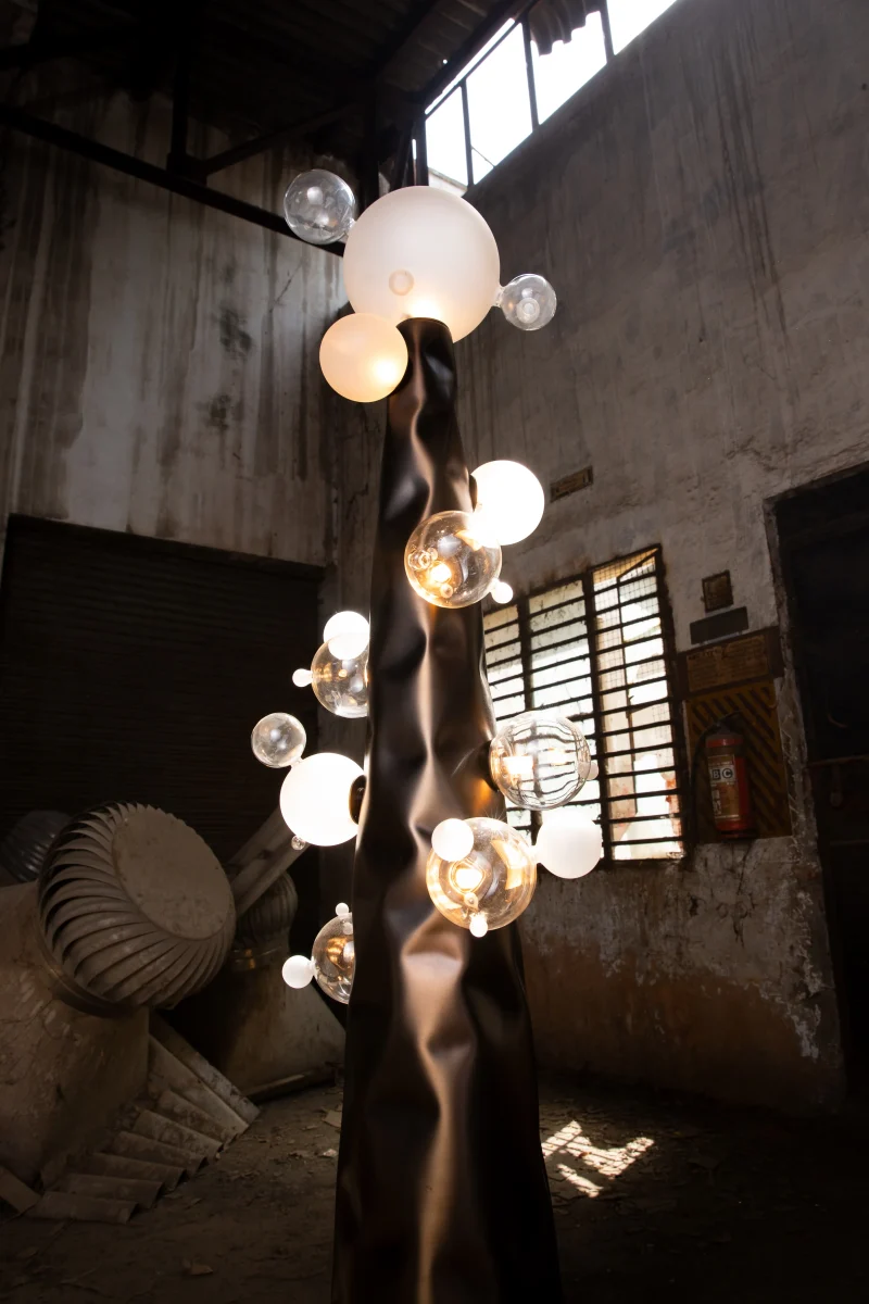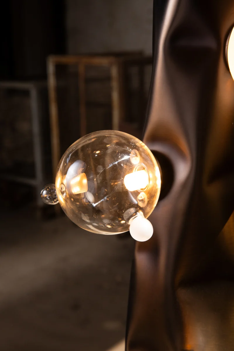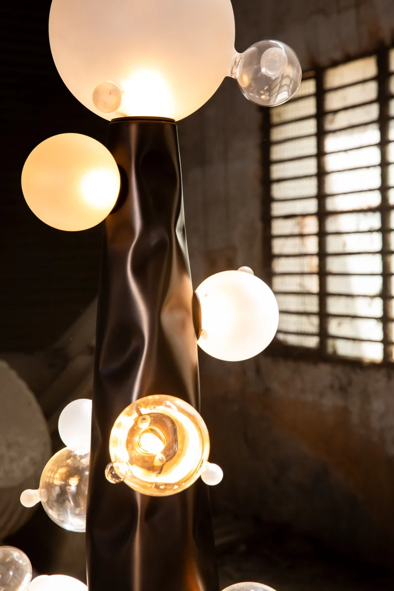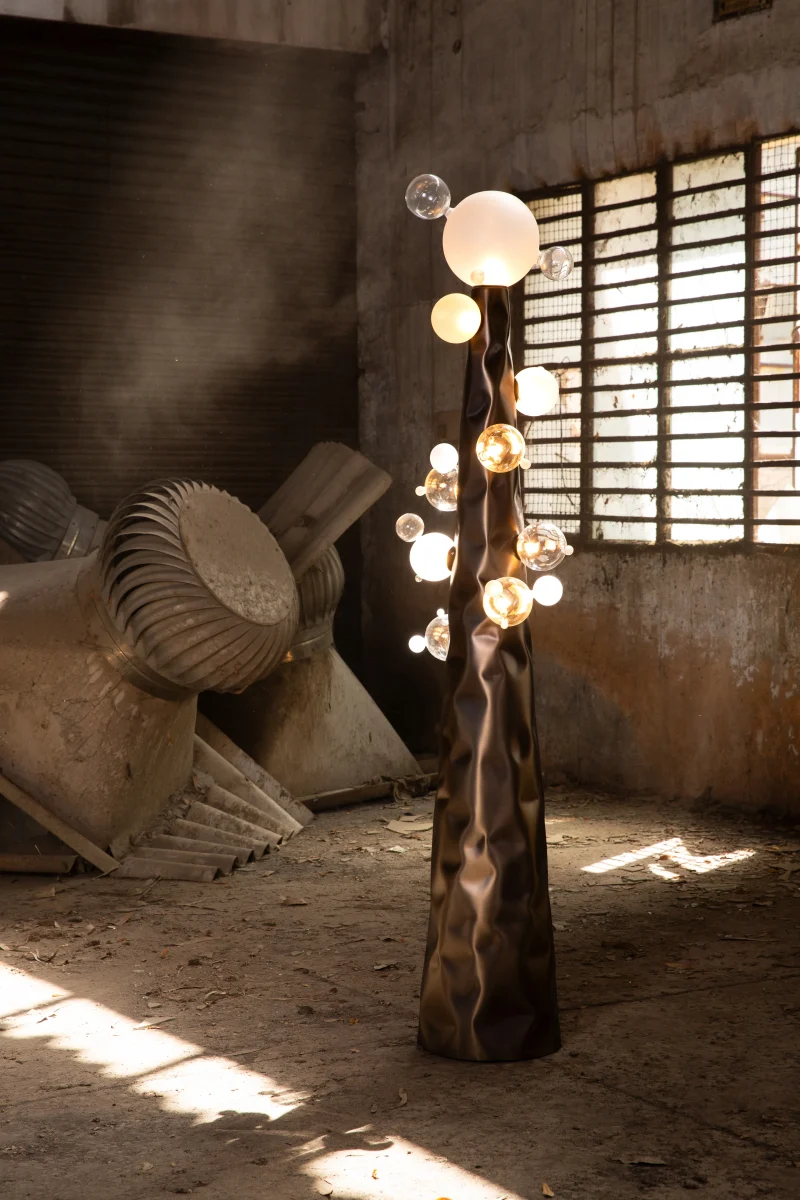 The Molecule Floor Lamp by Nitush and Aroosh merges sculptural design with functional lighting. Inspired by molecular forms, it features blown glass balls—both clear and frosted—arranged to create a captivating interplay of light. The crumpled stainless steel body balances Nitush-Aroosh’s signature textured finish with elements of light, creating a harmony where the materials don’t simply coexist but amplify each other. The intricate texture interacts uniquely with light, illuminating the surface and evoking subtle, layered shadows. This careful fusion invites viewers to engage with the piece from various perspectives, allowing light and material to evolve together in a form that is both functional and captivating.