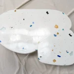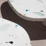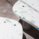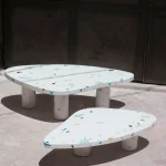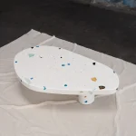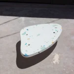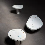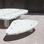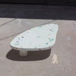 The Mono Coffee Table takes part of the MONOMORFO collection. It has an elongated amorphous top that fits 8 seats. The terrazzo composition is made of leftover glass crystals from a glass crystal factory in Minas Gerais, Brazil. This leftover material contributes to the creation of unique and colorful patterns for each table produced.