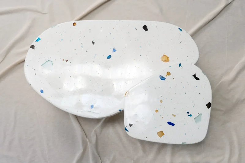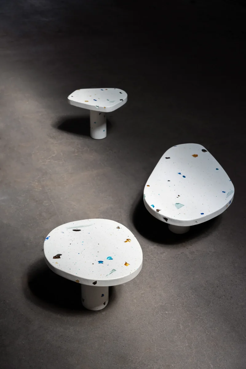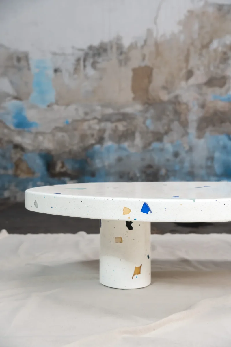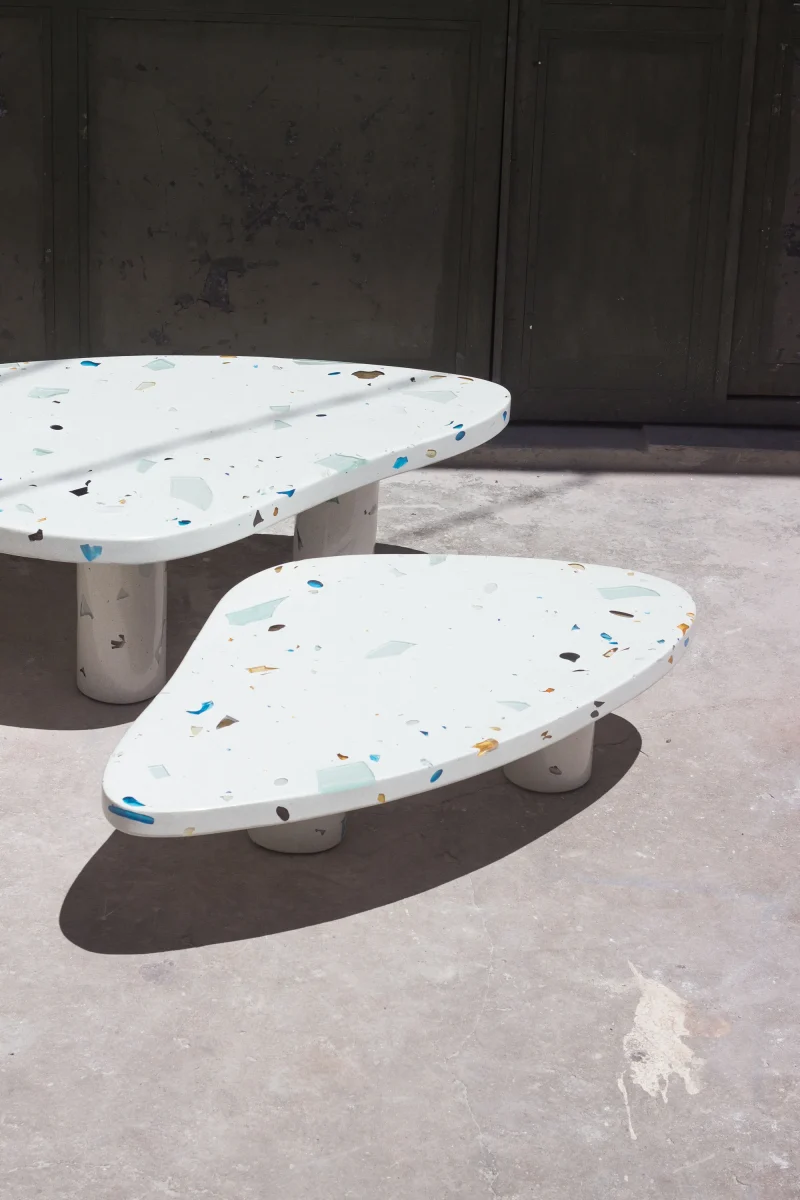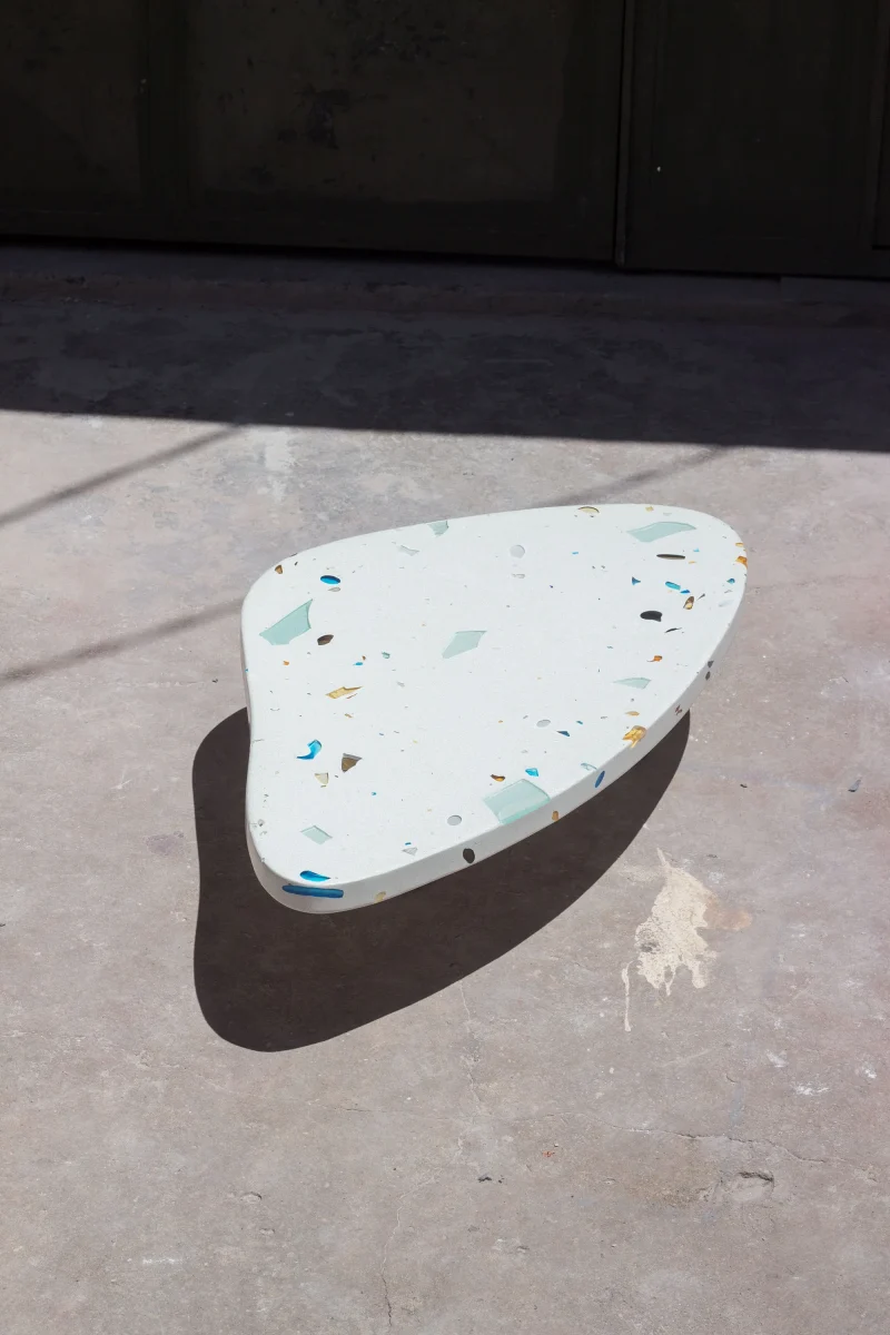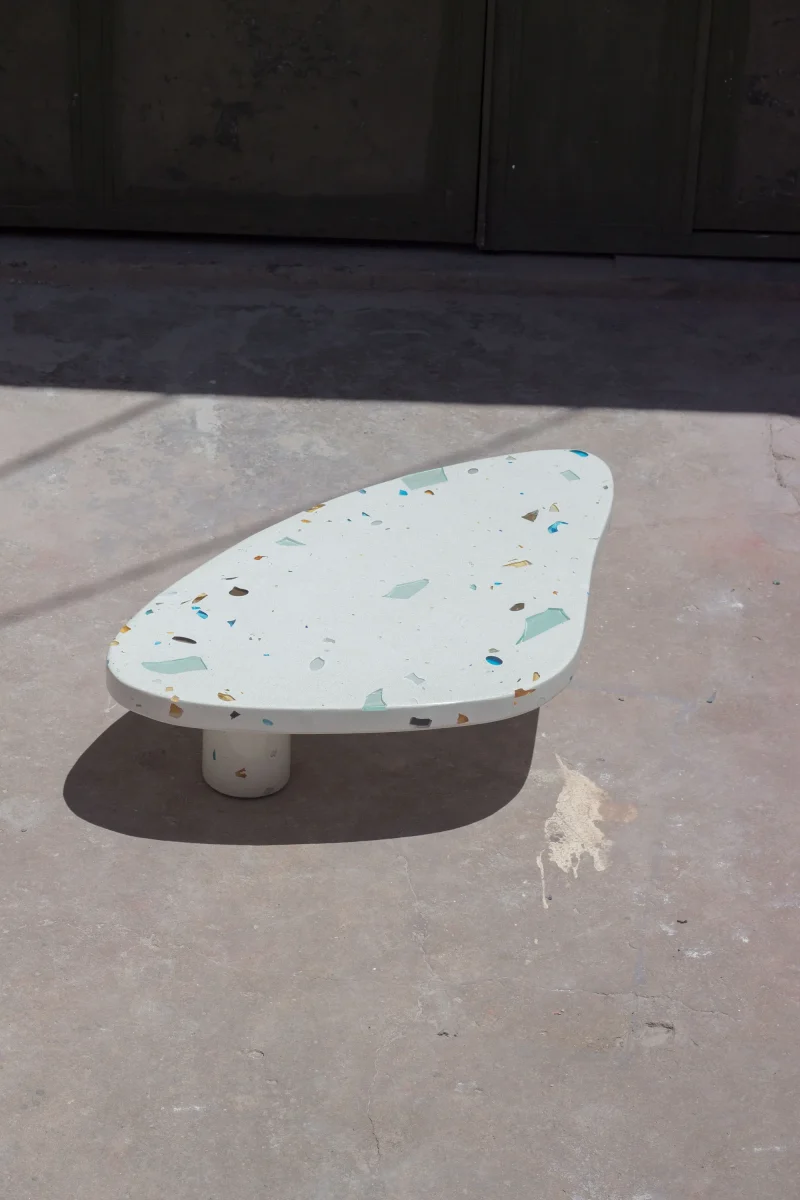 The Mono Coffee Table takes part of the MONOMORFO collection. It has an elongated amorphous top that fits 8 seats. The terrazzo composition is made of leftover glass crystals from a glass crystal factory in Minas Gerais, Brazil. This leftover material contributes to the creation of unique and colorful patterns for each table produced.