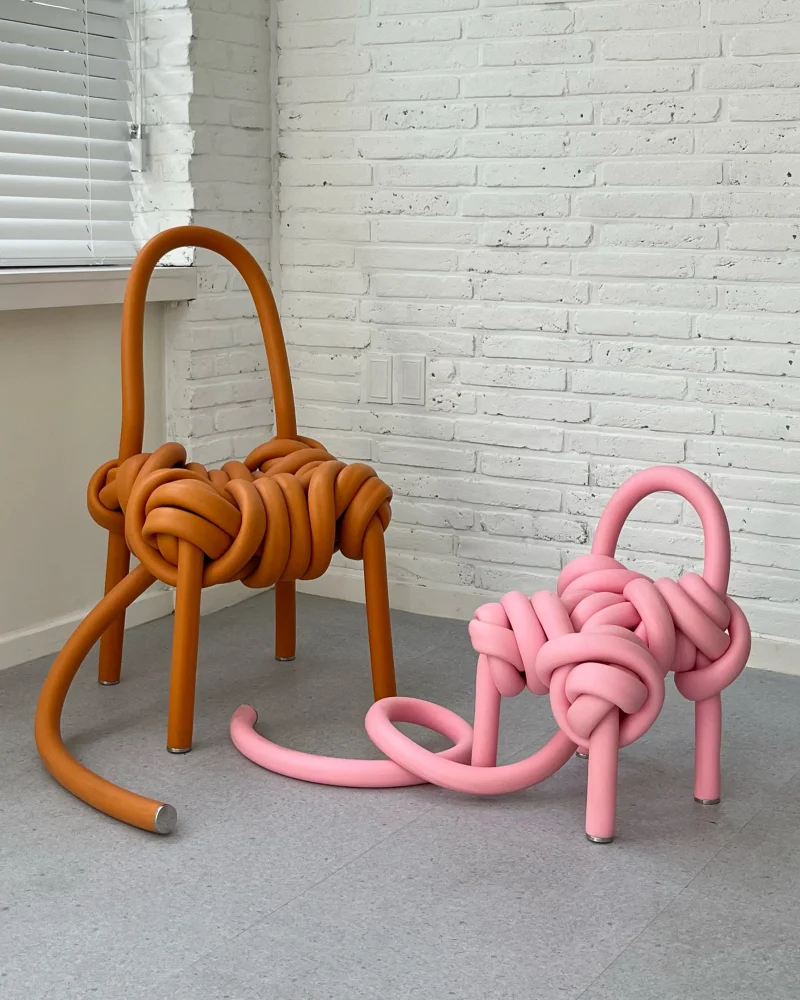 The chair is crafted using a metal framework as its foundation, with soft and flexible silicone material wrapped around it to create its shape spontaneously. This process relies on the artist’s intuition and craftsmanship, giving each piece a unique identity. As every Knot Chair is handmade, the details of the knots differ with each work, emphasizing its originality and individuality. Additionally, slight variations in size (1–5 cm) may occur during the production process, highlighting the inherent characteristics of handcrafted work and enhancing the chair’s distinctiveness.
