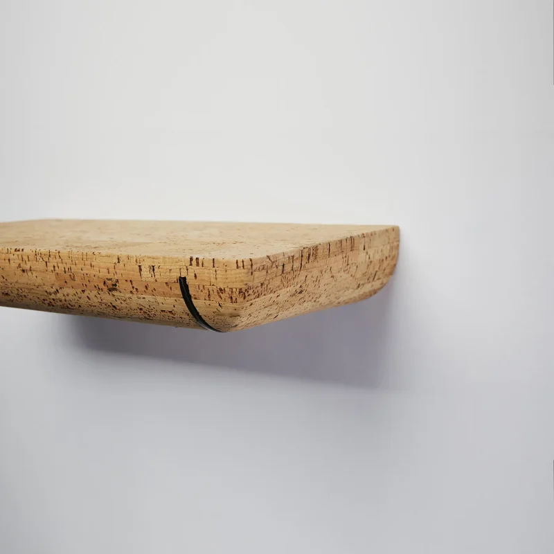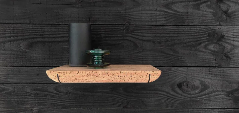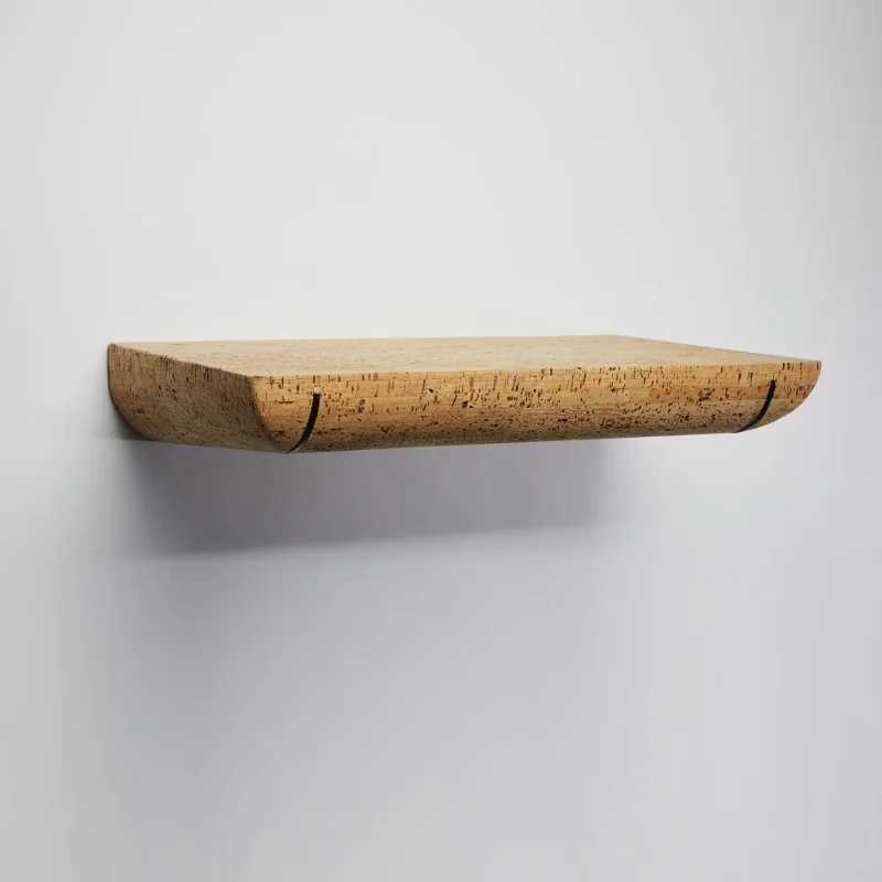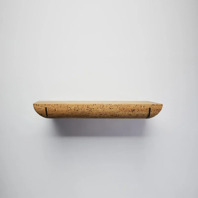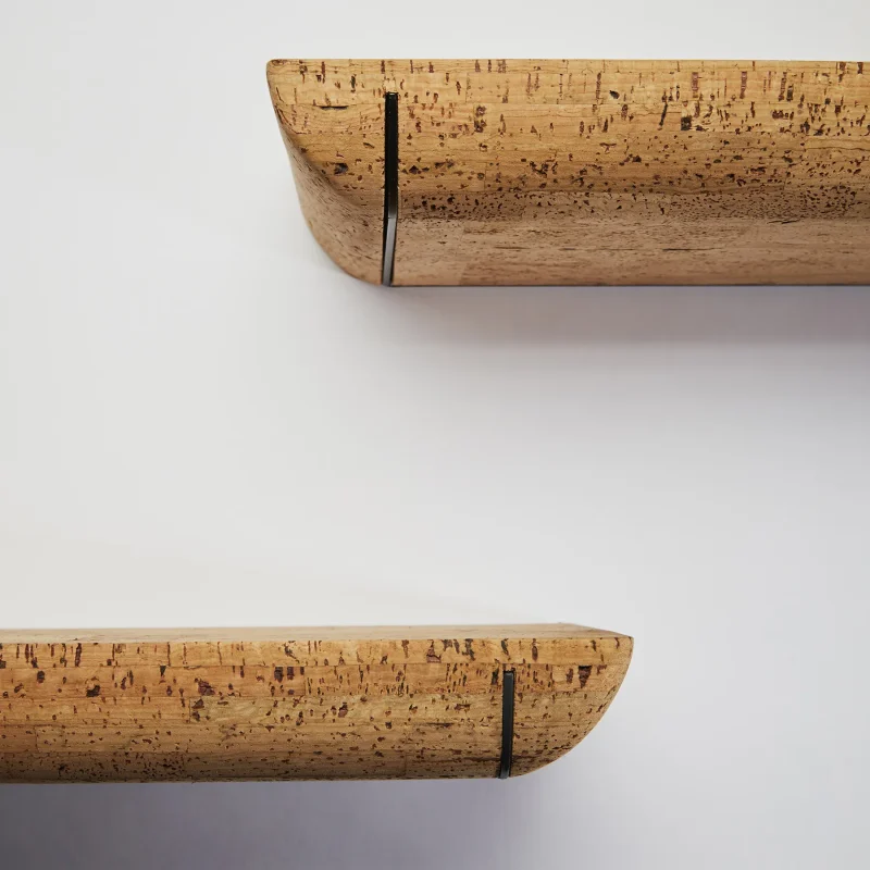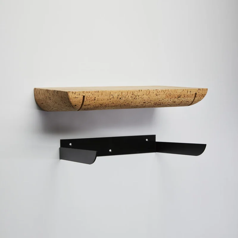 These cork shelves highlights the quality of the materials with the simplicity of Scandinavian design. Inspired by mortise and tenon wooden joints. The metal is inlaid in the cork as a subtle detail. Simple and soft shapes without superfluous details for timeless design.