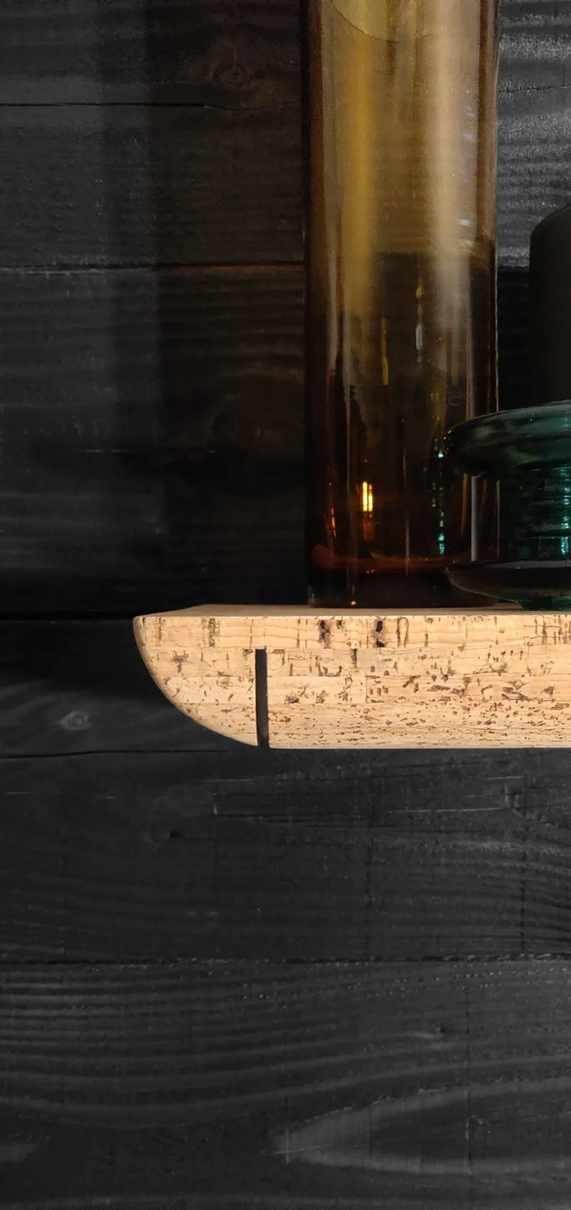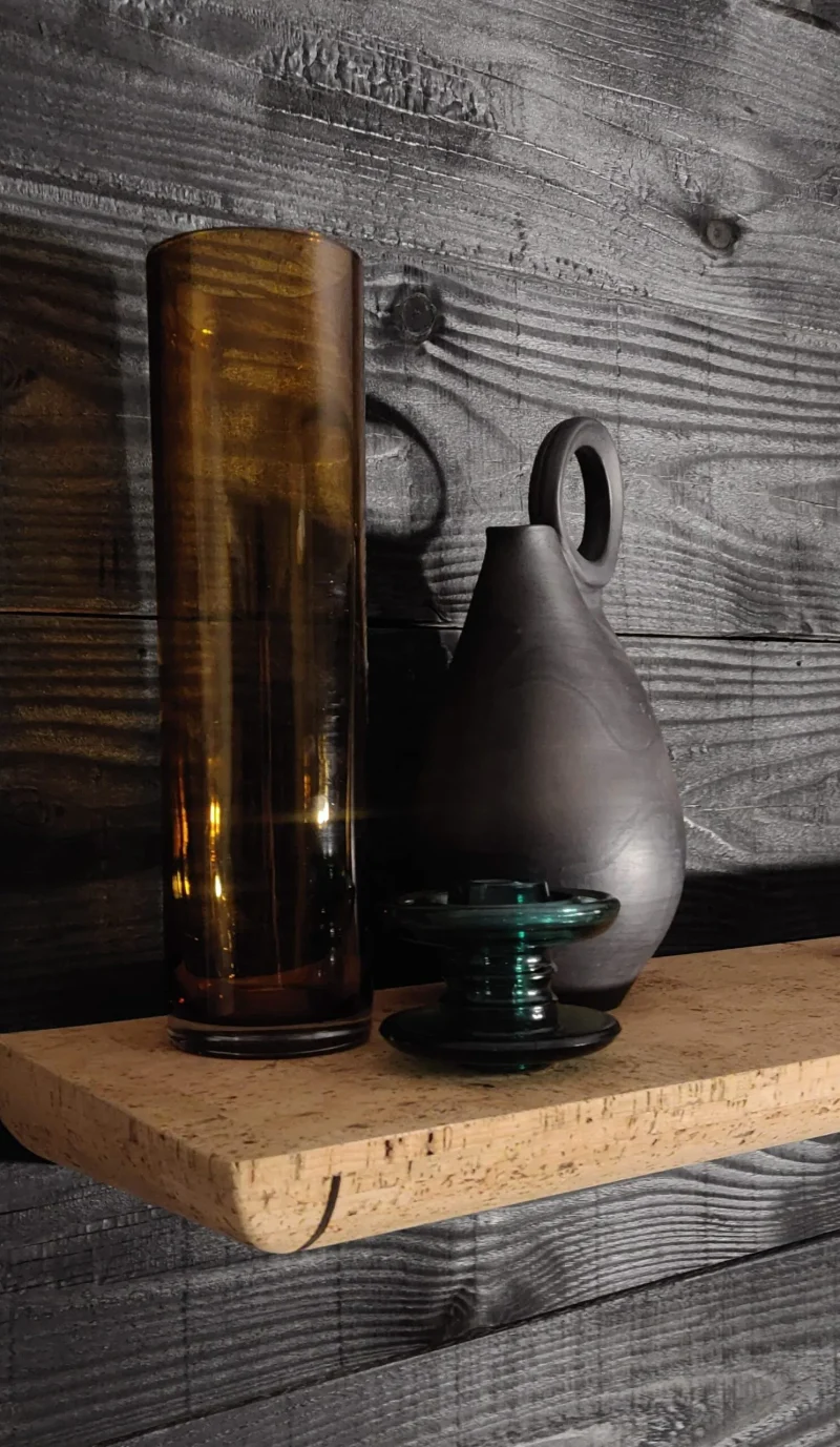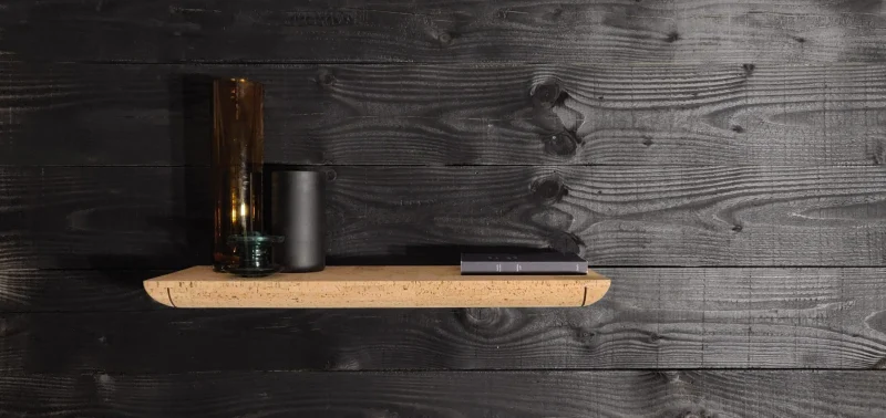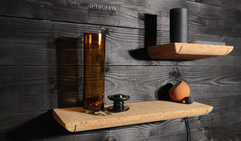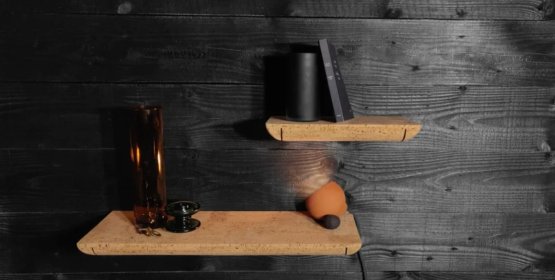 These cork shelves highlights the quality of the materials with the simplicity of Scandinavian design. Inspired by mortise and tenon wooden joints. The metal is inlaid in the cork as a subtle detail. Simple and soft shapes without superfluous details for timeless design.