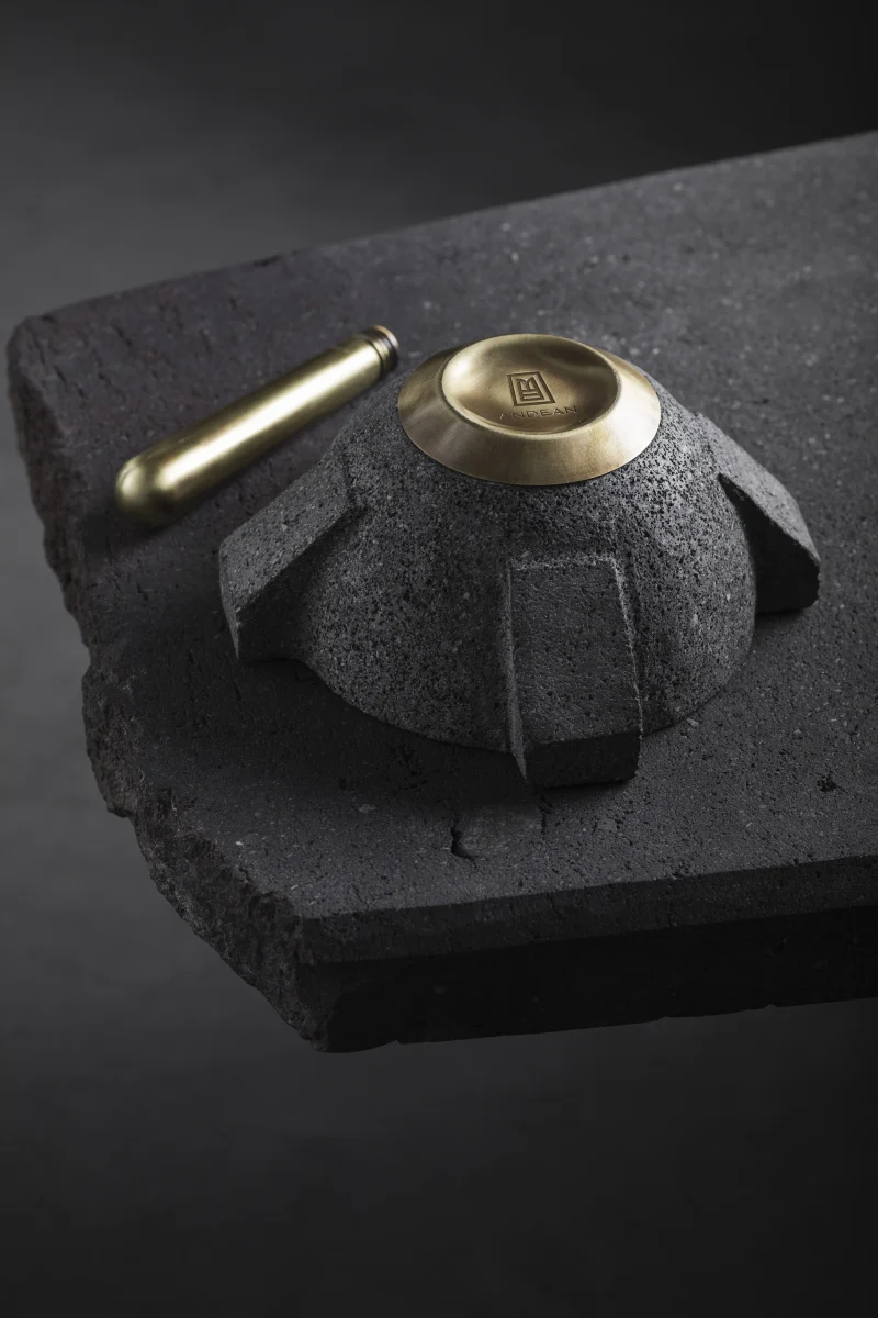 Drawing inspiration from the sacral and baroque motifs of Quito, as well as Ecuador’s highest and dormant volcano, these bowls are meticulously hand-carved from volcanic stone sourced from Chimborazo’s quarries and elegantly paired with CNC-lathed solid seike wood and bronze accents.