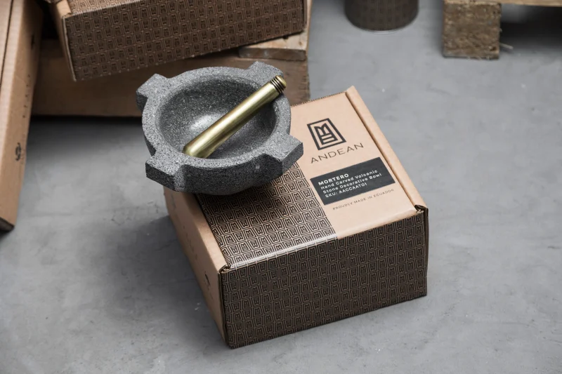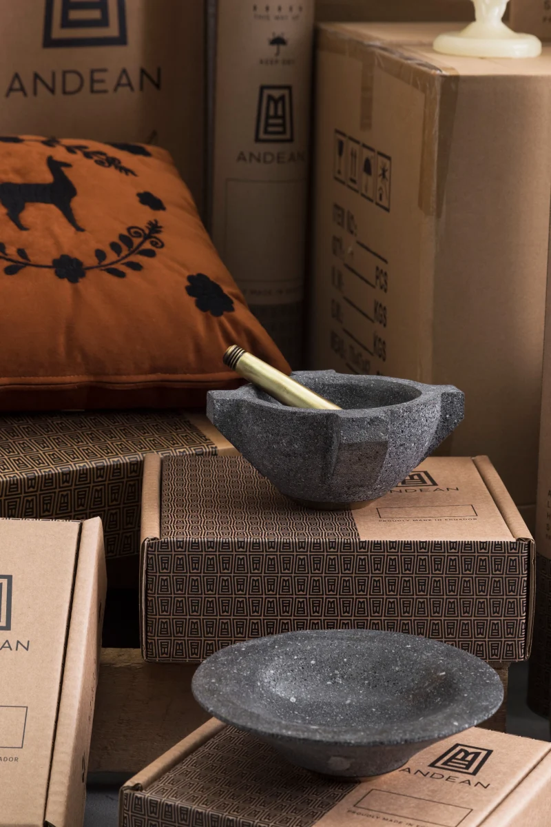 SOULFUL OBJECTS represent a journey through our heritage and traditions. A family of objects that depict the autochthonous materials and artisan methods of Ecuador. The collection comprises an array of decorative and functional objects— bowls, candleholders, decorative pillows, and tapestries— showcasing materials such as hand-carved volcanic stone from the quarries of Chimborazo, Ecuador’s highest and dormant volcano, opulent bronze, stainless steel, and sumptuous velvet.