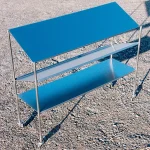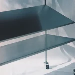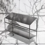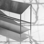 Presenting the “Moving Shelves” series by Georgiev Zabeta, a design practice based in Sofia, Bulgaria. Crafted from brushed stainless steel, these minimalist shelves designed for easy mobility, feature two slanted shelves with angled edges to stylishly showcase books without slipping. The movable wheels offer adaptability, emphasizing the duo’s commitment to functional design.