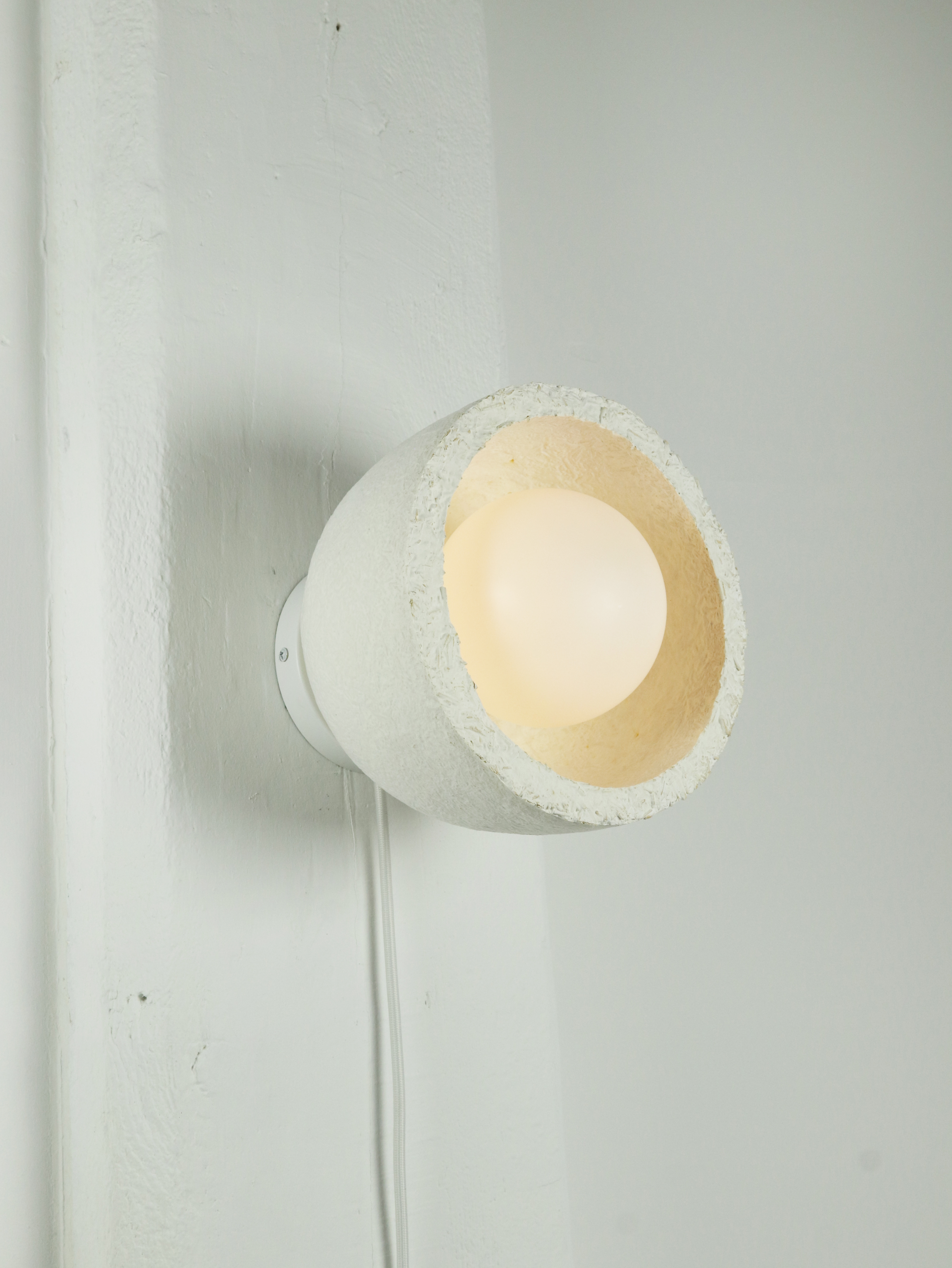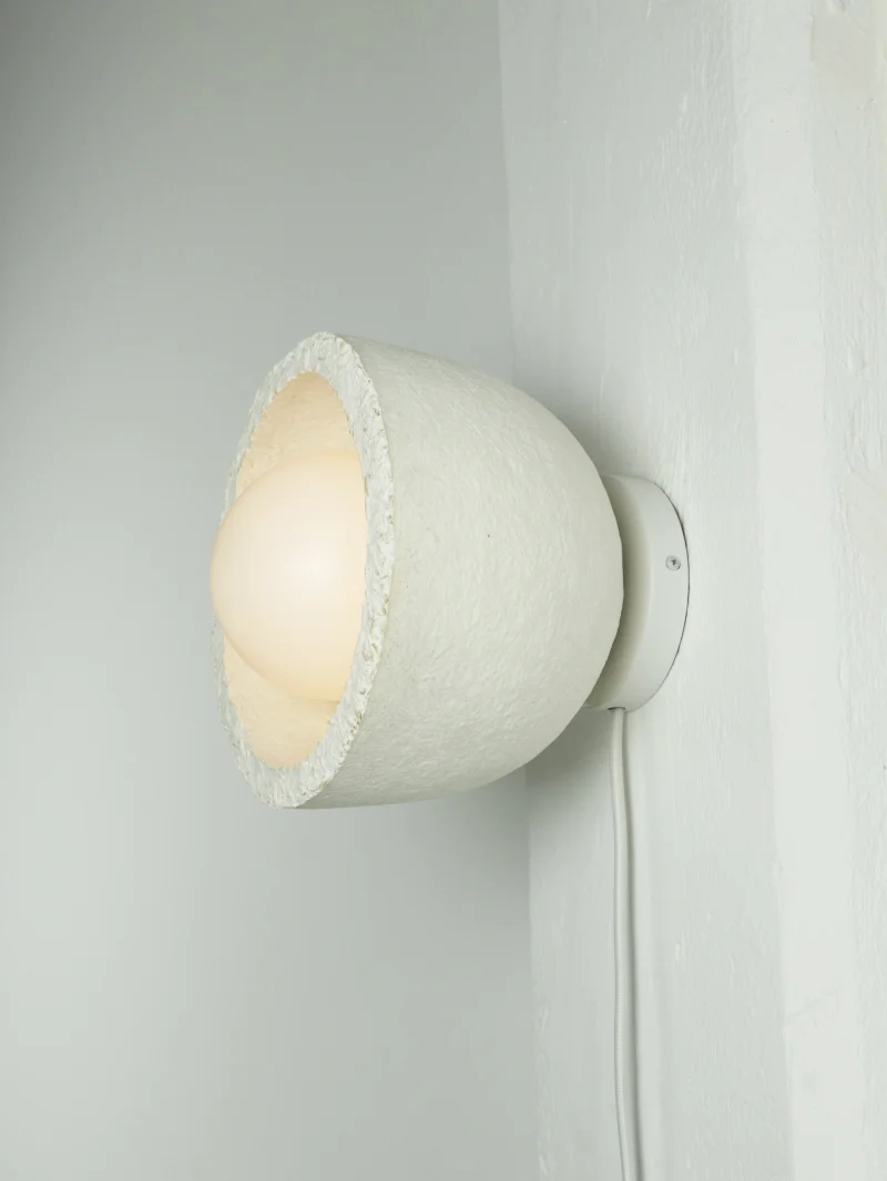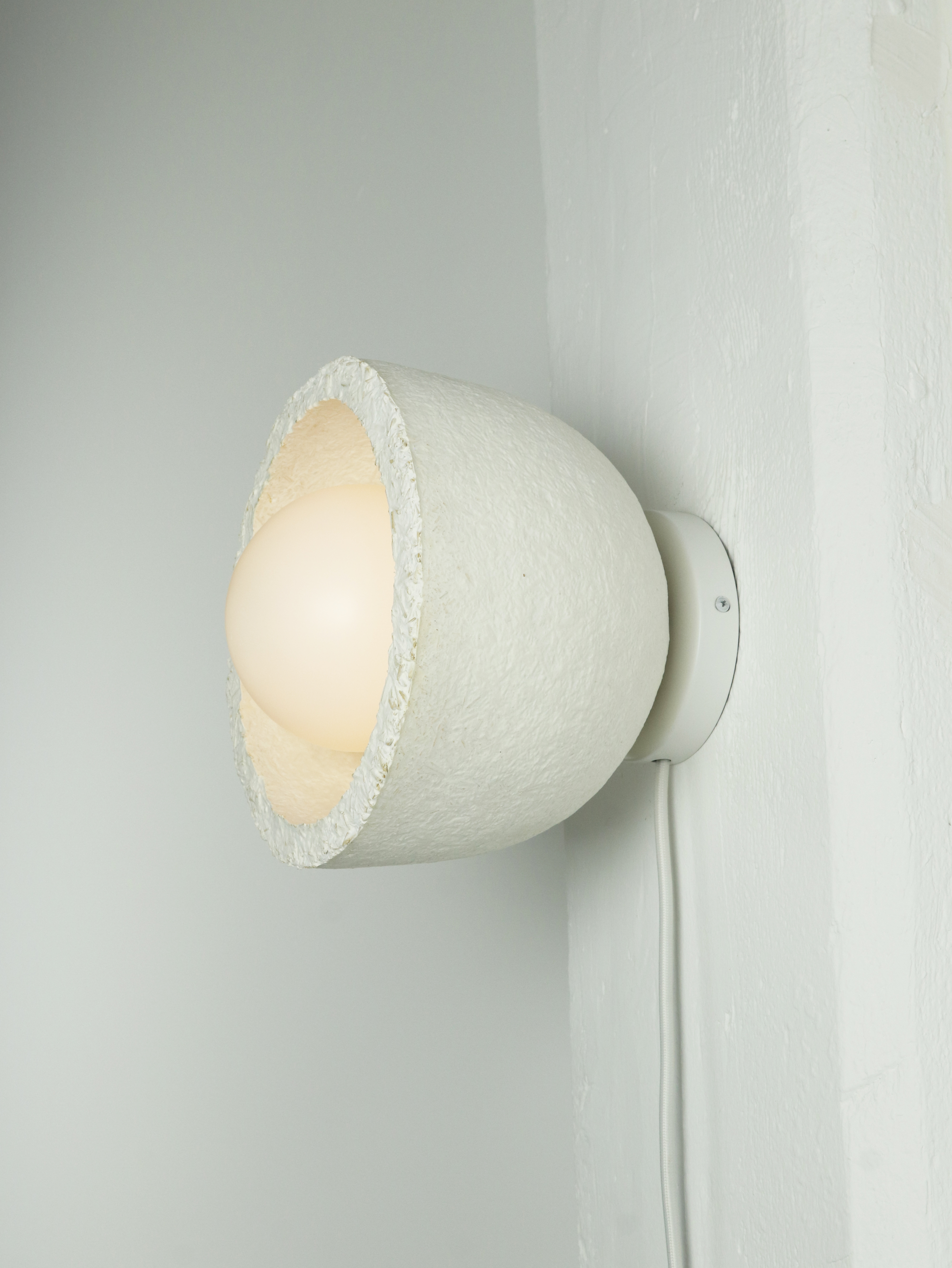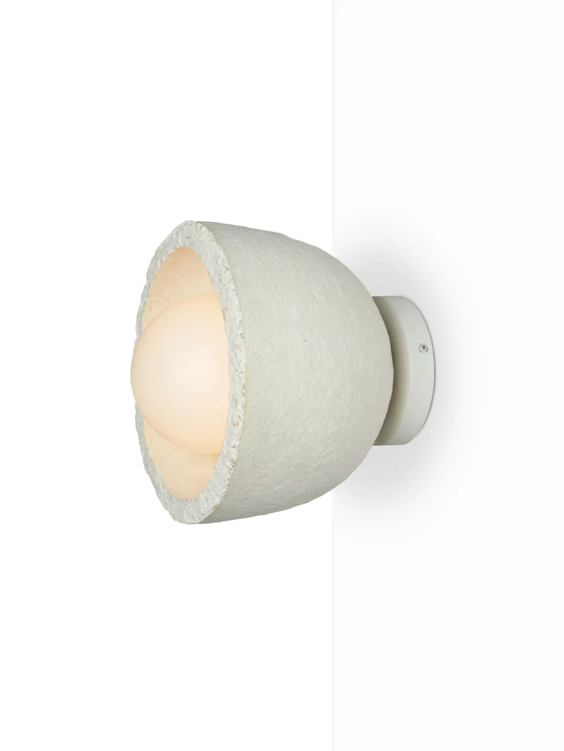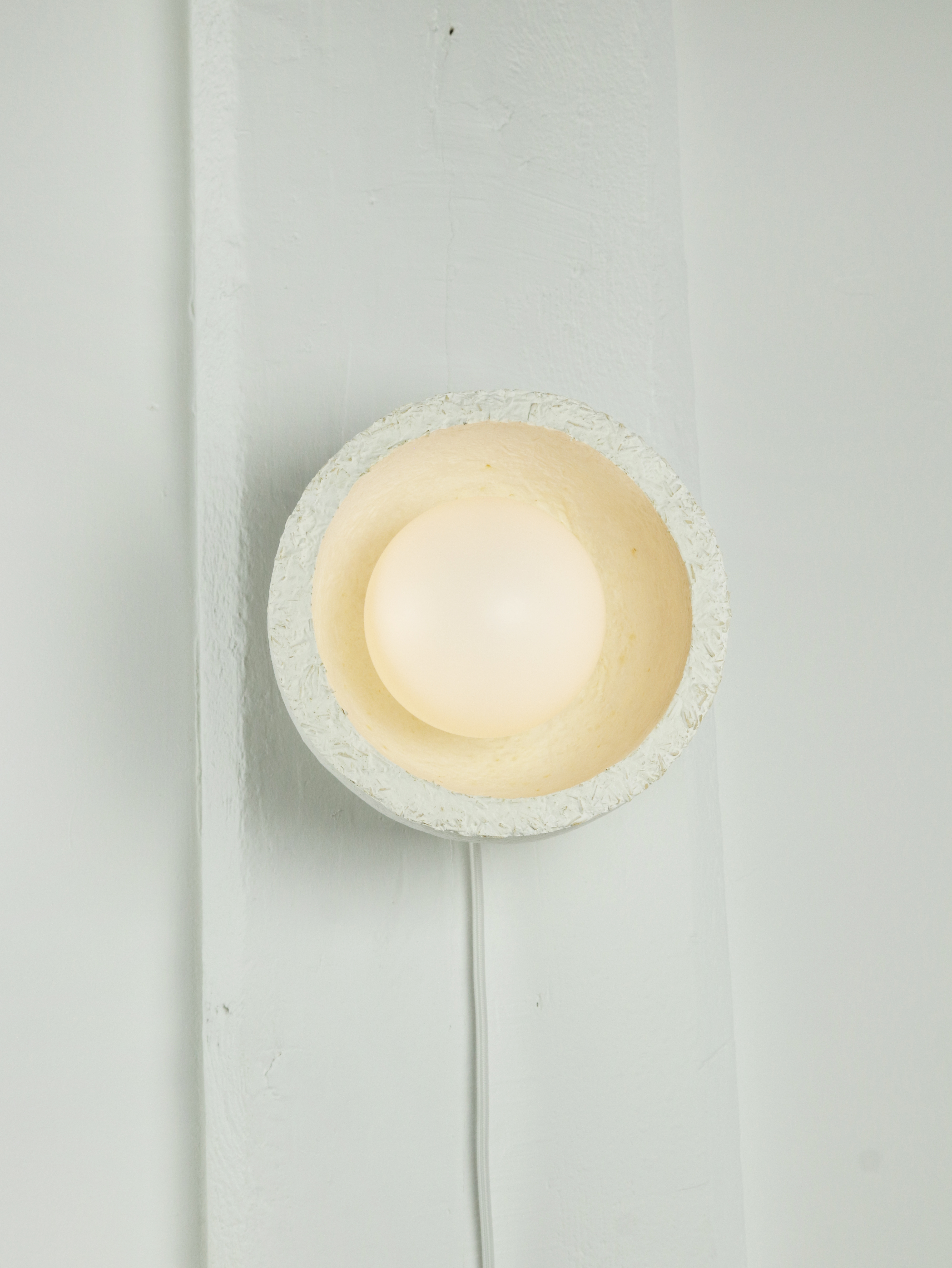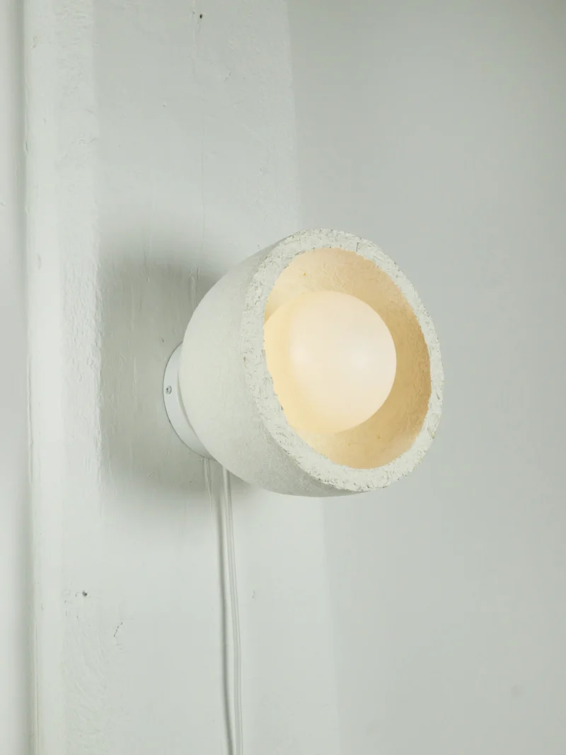 Crafted from sustainable mushroom mycelium, the Cup Light Sconce expands our pendant design into a bold flush mount fixture, ideal for lighting hallways, bathrooms, or creating an eye-catching art installation. Its sleek profile makes it a versatile addition to any interior space.