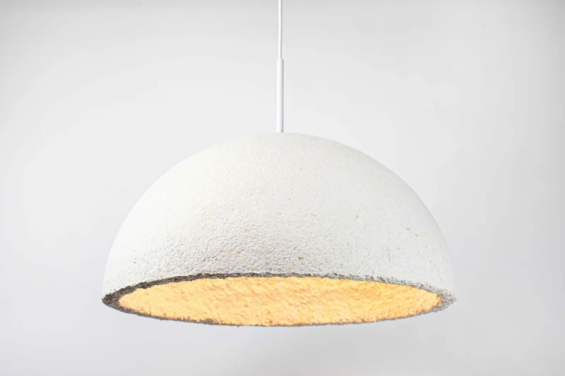 MushLume is an award-winning biofabricated lighting collection that is GROWN, not manufactured, from mycelium—the roots of mushrooms. The lampshades are made by combining sustainably sourced hemp with mycelium, a rapidly renewable organism. In just a few days, the mycelium grows and binds to the hemp, forming a solid structure in custom molds. Once fully grown, the lampshades are dried and heated, resulting in a stable, biodegradable product.